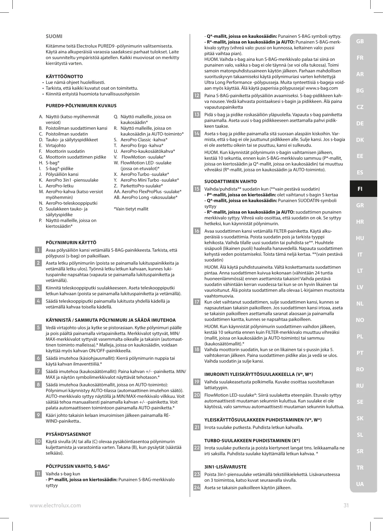 SUOMI - Q*-mallit, joissa on kaukosäädin: Punainen S-BAG symboli syttyy. - R*-mallit, joissa on kaukosäädin ja AUTO: Punainen S-BAG-merkkivalo syttyy (vihreä valo: pussi on kunnossa, keltainen valo: pussi pitää vaihtaa pian). HUOM. Vaihda s-bag aina kun S-BAG-merkkivalo palaa tai siinä on punainen valo, vaikka s-bag ei ole täynnä (se voi olla tukossa). Toimi samoin matonpuhdistusaineen käytön jälkeen. Parhaan mahdollisen suorituskyvyn takaamiseksi käytä pölynimuriasi varten kehitettyjä Ultra Long Performance -pölypusseja. Muita synteettisiä s-bageja voidaan myös käyttää. Älä käytä paperisia pölypusseja! www.s-bag.com Kiitämme teitä Electrolux PURED9 -pölynimurin valitsemisesta. Käytä aina alkuperäisiä varaosia saadaksesi parhaat tulokset. Laite on suunniteltu ympäristöä ajatellen. Kaikki muoviosat on merkitty kierrätystä varten.