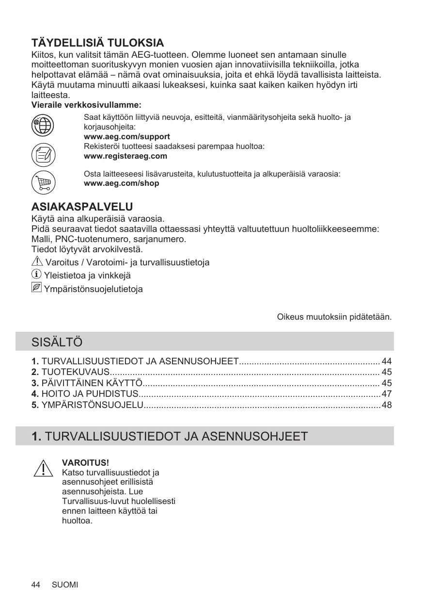 2 Obtenir des conseils d’utilisation, des brochures, un dépanneur, des informations sur le service et les réparations : www.aeg.com/support Enregistrer votre produit pour un meilleur service : www.registeraeg.com Acheter des accessoires, consommables et pièces de rechange d’origine pour votre appareil : www.aeg.com/shop