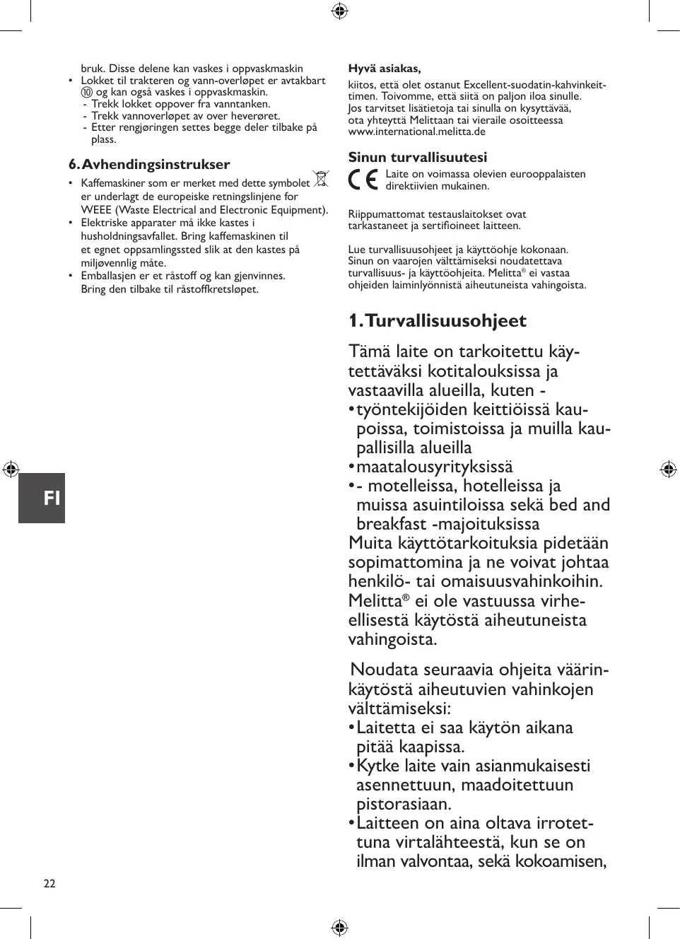 - Emballasjen er et råstoff og kan gjenvinnes. Bring den tilbake til råstoffkretsløpet. Hyvä asiakas, kiitos, että olet ostanut Excellent-suodatin-kahvinkeittimen. Toivomme, että siitä on paljon iloa sinulle. Jos tarvitset lisätietoja tai sinulla on kysyttävää, ota yhteyttä Melittaan tai vieraile osoitteessa www.international.melitta.de Sinun turvallisuutesi Laite on voimassa olevien eurooppalaisten direktiivien mukainen. Riippumattomat testauslaitokset ovat tarkastaneet ja sertifioineet laitteen. Lue turvallisuusohjeet ja käyttöohje kokonaan. Sinun on vaarojen välttämiseksi noudatettava turvallisuus- ja käyttöohjeita. Melitta® ei vastaa ohjeiden laiminlyönnistä aiheutuneista vahingoista. 1.Turvallisuusohjeet