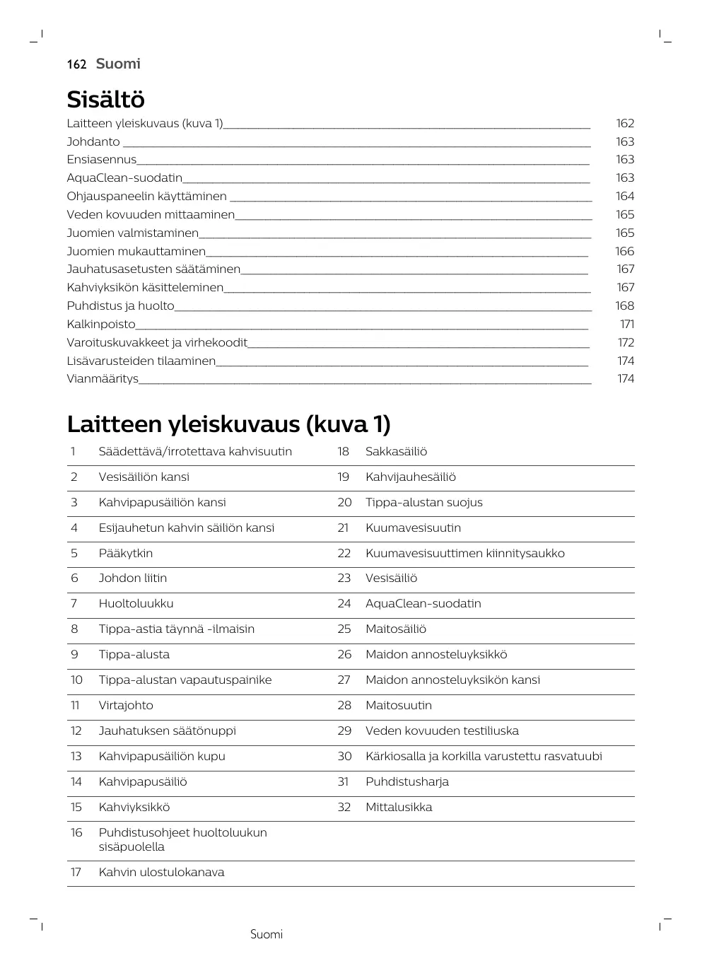Kaada maitojärjestelmän puhdistusaine pussista maitokannuun. Täytä sitten maitokannu vedellä MAX-merkkiin (kuva 32) asti. Aseta ensin maitokannu laitteeseen ja sitten säiliö maitosuuttimen alle. Paina MENU (Valikko) -painiketta, valitse DRINKS (Juomat) ja selaa MILK FROTH (Maitovaahto) kohtaan. Käynnistä puhdistusliuoksen annostelu painamalla OK-painiketta. Toista vaihe 3, kunnes maitokannu on tyhjä. Kun kannu on tyhjä, irrota säiliö ja maitokannu laitteesta. Huuhtele maitokannu huolellisesti ja täytä se puhtaalla vedellä MAX-merkkiin asti. Aseta maitokannu laitteeseen. Aseta säiliö maitosuuttimen alle. Käynnistä kannun huuhtelujakso painamalla MENU (Valikko) -painiketta ja valitse DRINKS (Juomat) -valikosta MILK FROTH (Maitovaahto). Toista vaihe 9, kunnes maitokannu on tyhjä. Toista vaiheet 6–10. Kun laite ei enää annostele vettä, puhdistusjakso on valmis. Pura kaikki osat ja huuhtele ne haalealla, juoksevalla vedellä. Kalkinpoisto Käytä vain Philips kalkinpoistoainetta. Älä missään tapauksessa käytä rikkihappoa, suolahappoa tai etikkahappoa (viinietikkaa) sisältävää kalkinpoistoainetta, sillä se voi vahingoittaa laitteen vesijärjestelmää, eikä se ehkä poista kalkkia kunnolla. Takuu raukeaa, jos käytät muuta kuin Philips kalkinpoistoainetta. Takuu raukeaa myös silloin, jos et poista kalkkia laitteesta. Voit ostaa Philips kalkinpoistoainetta verkkokaupasta osoitteessa www.saeco.com/care. 1 Kun laite pyytää sinua suorittamaan kalkinpoiston (kuva 33), käynnistä se painamalla OKpainiketta. Jos haluat käynnistää kalkinpoiston ilman laitteen kehotusta, paina MENU (Valikko) painiketta, selaa START CALC CLEAN (Aloita kalkinpoisto) -kohtaan ja vahvista OK-painikkeella. - Näyttö muistuttaa maitokannun asettamisesta paikalleen. Täytä maitokannu vedellä MINmerkkiin asti. Aseta maitokannu laitteeseen ja avaa maitosuutin. - Näyttö muistuttaa maitosuuttimen avaamisesta. - Näyttö muistuttaa AquaClean-suodattimen poistamisesta. 2 Irrota tippa-alusta ja sakkasäiliö, tyhjennä ne ja aseta ne takaisin paikalleen. 3 Irrota vesisäiliö ja tyhjennä se. 4 Aseta suuri säiliö (1,5 l) kahvisuuttimen alle. 5 Kaada vesisäiliöön koko pullollinen Philipsin kalkinpoistoainetta ja täytä vesisäiliö puhtaalla vedellä CALC CLEAN (kuva 34) -merkkiin asti. Aseta sitten vesisäiliö takaisin laitteeseen ja vahvista painamalla OK-painiketta. 6 Kalkinpoiston ensimmäinen vaihe käynnistyy. Kalkinpoisto kestää noin 30 minuuttia ja se koostuu kalkinpoisto-ohjelmasta ja huuhteluohjelmasta. 7 Anna laitteen annostella kalkinpoistoliuosta, kunnes näyttö muistuttaa, että vesisäiliö on tyhjä. 172 Suomi 8 Tyhjennä vesisäiliö, huuhtele se ja täytä se raikkaalla vedellä CALC CLEAN -merkkiin asti. 9 Irrota ja huuhtele maitokannu. Täytä se raikkaalla vedellä MIN-merkkiin asti ja aseta vesisäiliö takaisin laitteeseen. Avaa sitten maitosuutin. 10 Tyhjennä säiliö ja aseta se takaisin kahvisuuttimen alle. Vahvista tiedot painamalla OK-painiketta. 11 Kalkinpoiston toinen vaihe, huuhtelujakso, käynnistyy. Se kestää 3 minuuttia. Näytössä näkyy huuhtelukuvake ja vaiheen kesto. 12 Odota, kunnes laite lopettaa veden annostelun. Kalkinpoisto on valmis, kun näytössä näkyy tarkistusmerkki. 13 Poistu kalkinpoistosta painamalla OK-painiketta. Laite käynnistää kuumenemiseen ja suorittaa automaattisen huuhtelun. 14 Puhdista maitokannu kalkinpoiston (katso 'Maitokannun viikoittainen puhdistus') jälkeen. 15 Puhdista kahviyksikkö kalkinpoiston (katso 'Kahviyksikön puhdistaminen juoksevalla vedellä') jälkeen. 16 Aseta uusi AquaClean-suodatin vesisäiliöön. Vinkki: AquaClean-suodattimen käyttö vähentää kalkinpoiston tarvetta. Toimenpiteet kalkinpoiston keskeytyessä Voit päättää kalkinpoiston painamalla ohjauspaneelin käynnistyspainiketta. Jos kalkinpoisto keskeytetään ennen sen päättymistä, toimi seuraavasti: 1 Tyhjennä ja huuhtele vesisäiliö perusteellisesti. 2 Täytä vesisäiliö CALC CLEAN -merkkiin asti kylmällä vedellä ja käynnistä laite uudelleen. Laite kuumenee ja suorittaa automaattisen huuhtelun. 3 Suorita ennen juomien annostelua manuaalinen huuhtelujakso. Jos haluat suorittaa manuaalisen huuhtelun, annostele ensin puoli säiliöllistä kuumaa vettä ja valmista sen jälkeen kaksi kupillista valmiiksi jauhettua kahvia lisäämättä jauhettua kahvia. Huomautus: Jos kalkinpoistoa ei suoritettu loppuun, laitteessa on tehtävä uusi kalkinpoisto mahdollisimman pian. Varoituskuvakkeet ja virhekoodit Varoituskuvakkeiden merkitys Varoituskuvakkeiden merkitys Varoituskuvakkeet näkyvät punaisina. Seuraavassa on luettelo näytössä mahdollisesti näkyvistä varoituskuvakkeista ja niiden merkityksestä. Täytä vesisäiliö puhtaalla vedellä MAX-merkkiin asti. ADD WATER ADD COFFEE Maitokannu ei ole paikallaan. Aseta maitokannu laitteeseen. INSERT CARAFE Kahvipapusäiliö on tyhjä. Lisää kahvipapusäiliöön uusia kahvipapuja. Kahvijauhesäiliö on täynnä. Varmista, että laitteeseen on kytketty virta. Irrota ja tyhjennä sen jälkeen sakkasäiliö. Suomi 173 INSERT WATER SPOUT