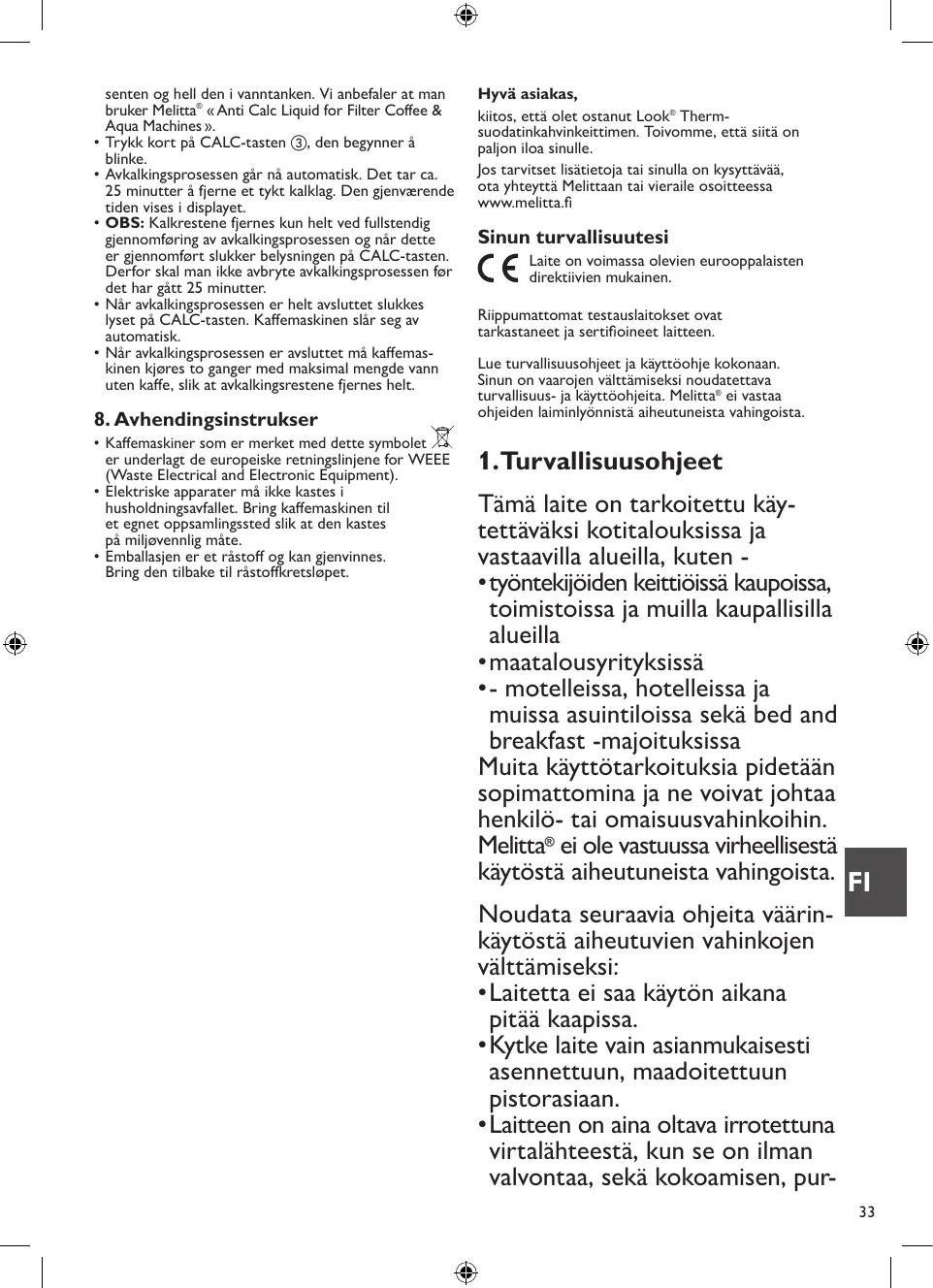 L‘appareil est conforme aux normes européennes en vigueur. L‘appareil a été contrôlé et certifié par des instituts de tests indépendants. Veuillez lire les consignes de sécurité et le mode d‘emploi dans leur intégralité. Afin d‘éviter tout danger, respectez les consignes de sécurité ainsi que le mode d‘emploi. Melitta® décline toute responsabilité en cas de dommages résultant d‘un non-respect des consignes.