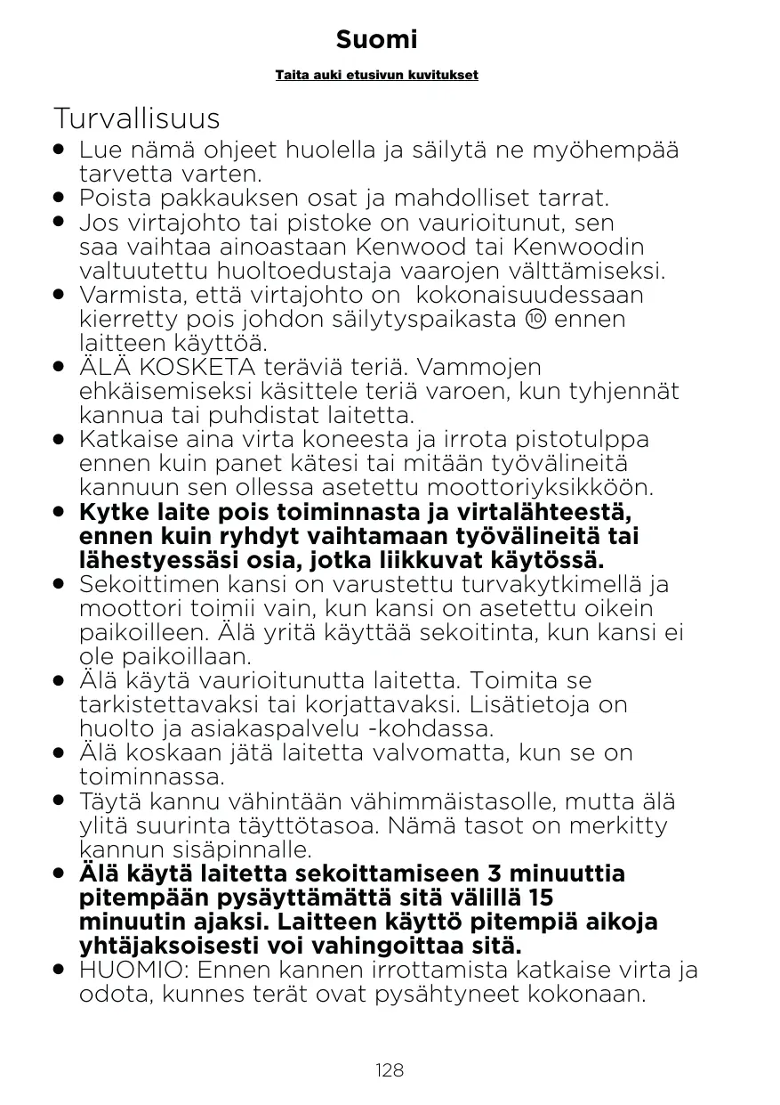 Lue nämä ohjeet huolella ja säilytä ne myöhempää tarvetta varten. O Poista pakkauksen osat ja mahdolliset tarrat. O Jos virtajohto tai pistoke on vaurioitunut, sen saa vaihtaa ainoastaan Kenwood tai Kenwoodin valtuutettu huoltoedustaja vaarojen välttämiseksi. O Varmista, että virtajohto on kokonaisuudessaan kierretty pois johdon säilytyspaikasta 10 ennen laitteen käyttöä. O ÄLÄ KOSKETA teräviä teriä. Vammojen ehkäisemiseksi käsittele teriä varoen, kun tyhjennät kannua tai puhdistat laitetta. O Katkaise aina virta koneesta ja irrota pistotulppa ennen kuin panet kätesi tai mitään työvälineitä kannuun sen ollessa asetettu moottoriyksikköön. O Kytke laite pois toiminnasta ja virtalähteestä, ennen kuin ryhdyt vaihtamaan työvälineitä tai lähestyessäsi osia, jotka liikkuvat käytössä. O Sekoittimen kansi on varustettu turvakytkimellä ja moottori toimii vain, kun kansi on asetettu oikein paikoilleen. Älä yritä käyttää sekoitinta, kun kansi ei ole paikoillaan. O Älä käytä vaurioitunutta laitetta. Toimita se tarkistettavaksi tai korjattavaksi. Lisätietoja on huolto ja asiakaspalvelu -kohdassa. O Älä koskaan jätä laitetta valvomatta, kun se on toiminnassa. O Täytä kannu vähintään vähimmäistasolle, mutta älä ylitä suurinta täyttötasoa. Nämä tasot on merkitty kannun sisäpinnalle. O Älä käytä laitetta sekoittamiseen 3 minuuttia pitempään pysäyttämättä sitä välillä 15 minuutin ajaksi. Laitteen käyttö pitempiä aikoja yhtäjaksoisesti voi vahingoittaa sitä. O HUOMIO: Ennen kannen irrottamista katkaise virta ja odota, kunnes terät ovat pysähtyneet kokonaan. O
