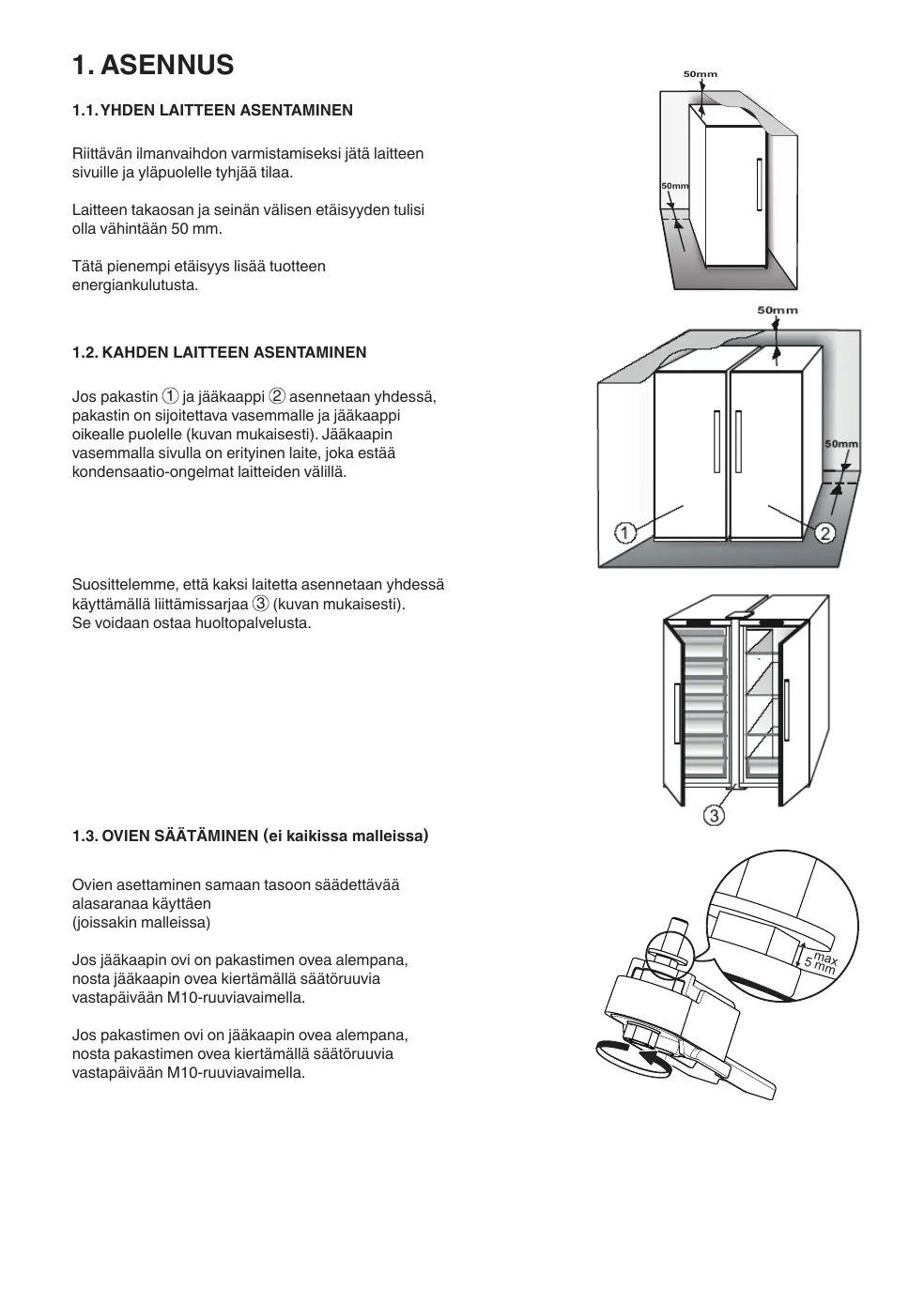 1.2. INSTALLATION DE DEUX APPAREILS Durant l'installation du congélateur 1 et du réfrigérateur 2 , assurez-vous que le congélateur est placé à gauche et le réfrigérateur à droite (comme illustré sur l'image). Sur le côté gauche du réfrigérateur se trouve un dispositif spécial permettant d'éviter les problèmes de condensation entre les appareils.