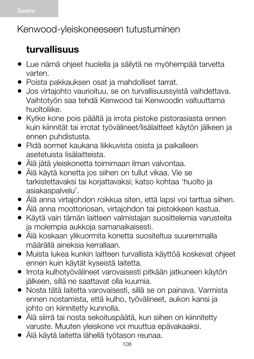 Si le cordon est endommagé, il doit être remplacé, pour des raisons de sécurité, par Kenwood ou par un réparateur agréé Kenwood. Éteignez et débranchez l’appareil avant d’adapter ou de retirer tout élément/accessoire, après l’utilisation et avant le nettoyage. N’approchez jamais vos doigts des éléments en mouvement ou des accessoires fixés sur votre robot. Ne laissez jamais le robot pâtissier multifonction sans surveillance lorsqu’il fonctionne. N’utilisez jamais un appareil endommagé ou en mauvais état. Faites-le vérifier et réparer. Pour cela reportez-vous à la rubrique ‘service après-vente’. Ne laissez jamais le cordon pendre de telle façon qu’un enfant puisse s’en saisir. Ne mouillez jamais le bloc moteur, le cordon d’alimentation ou la prise. N’utilisez jamais un accessoire non recommandé ou les deux sorties en même temps. Ne dépassez jamais les capacités maximales de charge de l’appareil telles qu’elles sont précisées. Lorsque vous utilisez un accessoire, lisez attentivement les instructions sur la sécurité concernant cet accessoire. Faites attention lorsque vous retirez les ustensiles du bol car ils peuvent être chauds. Cet appareil est lourd. Prenez donc des précautions lorsque vous le soulevez. Assurez-vous que la tête est verrouillée et que le bol, les ustensiles, le cache de la sortie et le cordon d’alimentation sont attachés avant de soulever l’appareil. Ne bougez pas la tête du robot, et ne la soulevez pas 23