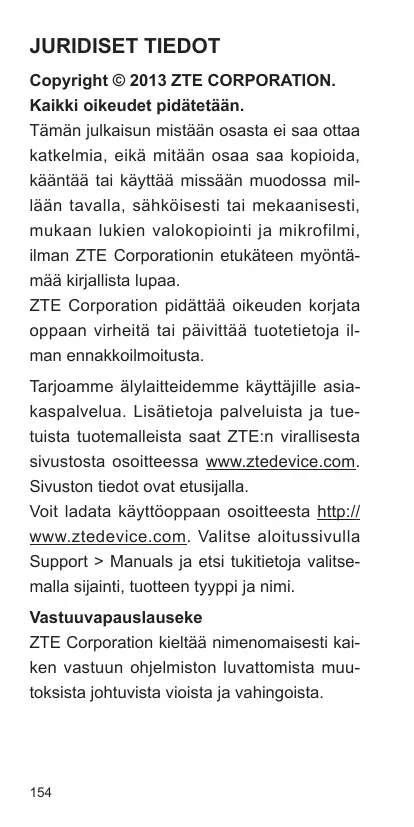 JURIDISET TIEDOT Copyright © 2013 ZTE CORPORATION. Kaikki oikeudet pidätetään. Tämän julkaisun mistään osasta ei saa ottaa katkelmia, eikä mitään osaa saa kopioida, kääntää tai käyttää missään muodossa millään tavalla, sähköisesti tai mekaanisesti, mukaan lukien valokopiointi ja mikrofilmi, ilman ZTE Corporationin etukäteen myöntämää kirjallista lupaa. ZTE Corporation pidättää oikeuden korjata oppaan virheitä tai päivittää tuotetietoja ilman ennakkoilmoitusta. Tarjoamme älylaitteidemme käyttäjille asiakaspalvelua. Lisätietoja palveluista ja tuetuista tuotemalleista saat ZTE:n virallisesta sivustosta osoitteessa www.ztedevice.com. Sivuston tiedot ovat etusijalla. Voit ladata käyttöoppaan osoitteesta http:// www.ztedevice.com. Valitse aloitussivulla Support > Manuals ja etsi tukitietoja valitsemalla sijainti, tuotteen tyyppi ja nimi. Vastuuvapauslauseke ZTE Corporation kieltää nimenomaisesti kaiken vastuun ohjelmiston luvattomista muutoksista johtuvista vioista ja vahingoista.