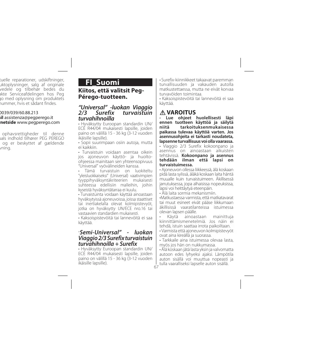 e attentivement les instructions nt l'utilisation et bien les server pour les consulter rieurement. Le non-respect des uctions pour l'installation du e-auto, entraînerait des risques r votre bébé. s opérations de montage et tallation de Viaggio 2/3 Surefix ent être effectuées par des es. L'opération de montage et stallation doit être effectuée l'enfant dans le siège-auto. ndant les voyages en voiture, ne is tenir le bébé dans ses bras, et ne is l'installer en dehors du siège. En e freinage brusque, même à faible e, l'enfant pourrait facilement être pulté vers l'avant. er d'introduire les doigts dans les anismes. voiture faire très attention aux ges ou autres objets qui pourraient er des lésions à l'enfant dans le e-auto en cas d'accident.
