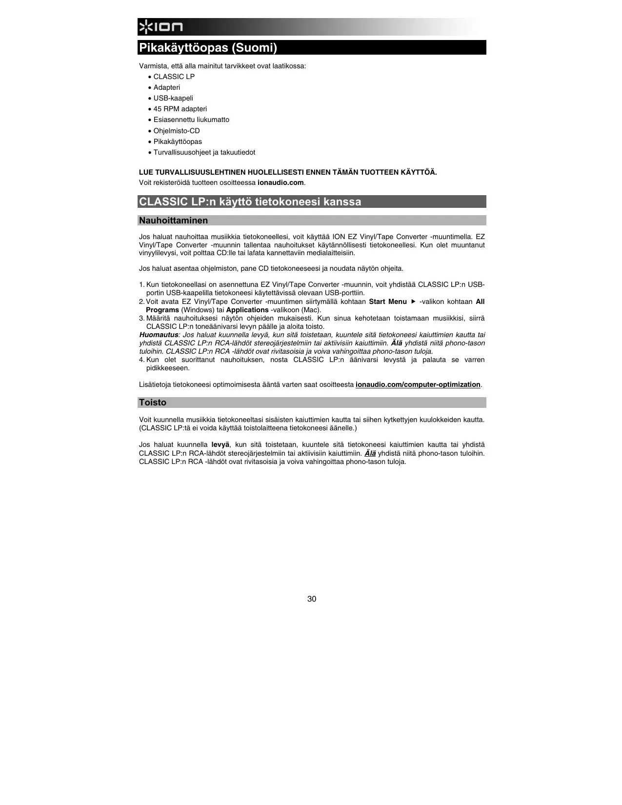 • Turvallisuusohjeet ja takuutiedot LUE TURVALLISUUSLEHTINEN HUOLELLISESTI ENNEN TÄMÄN TUOTTEEN KÄYTTÖÄ. Voit rekisteröidä tuotteen osoitteessa ionaudio.com. CLASSIC LP:n käyttö tietokoneesi kanssa Nauhoittaminen Jos haluat nauhoittaa musiikkia tietokoneellesi, voit käyttää ION EZ Vinyl/Tape Converter -muuntimella. EZ Vinyl/Tape Converter -muunnin tallentaa nauhoitukset käytännöllisesti tietokoneellesi. Kun olet muuntanut vinyylilevysi, voit polttaa CD:lle tai lafata kannettaviin medialaitteisiin. Jos haluat asentaa ohjelmiston, pane CD tietokoneeseesi ja noudata näytön ohjeita. 1. Kun tietokoneellasi on asennettuna EZ Vinyl/Tape Converter -muunnin, voit yhdistää CLASSIC LP:n USBportin USB-kaapelilla tietokoneesi käytettävissä olevaan USB-porttiin.