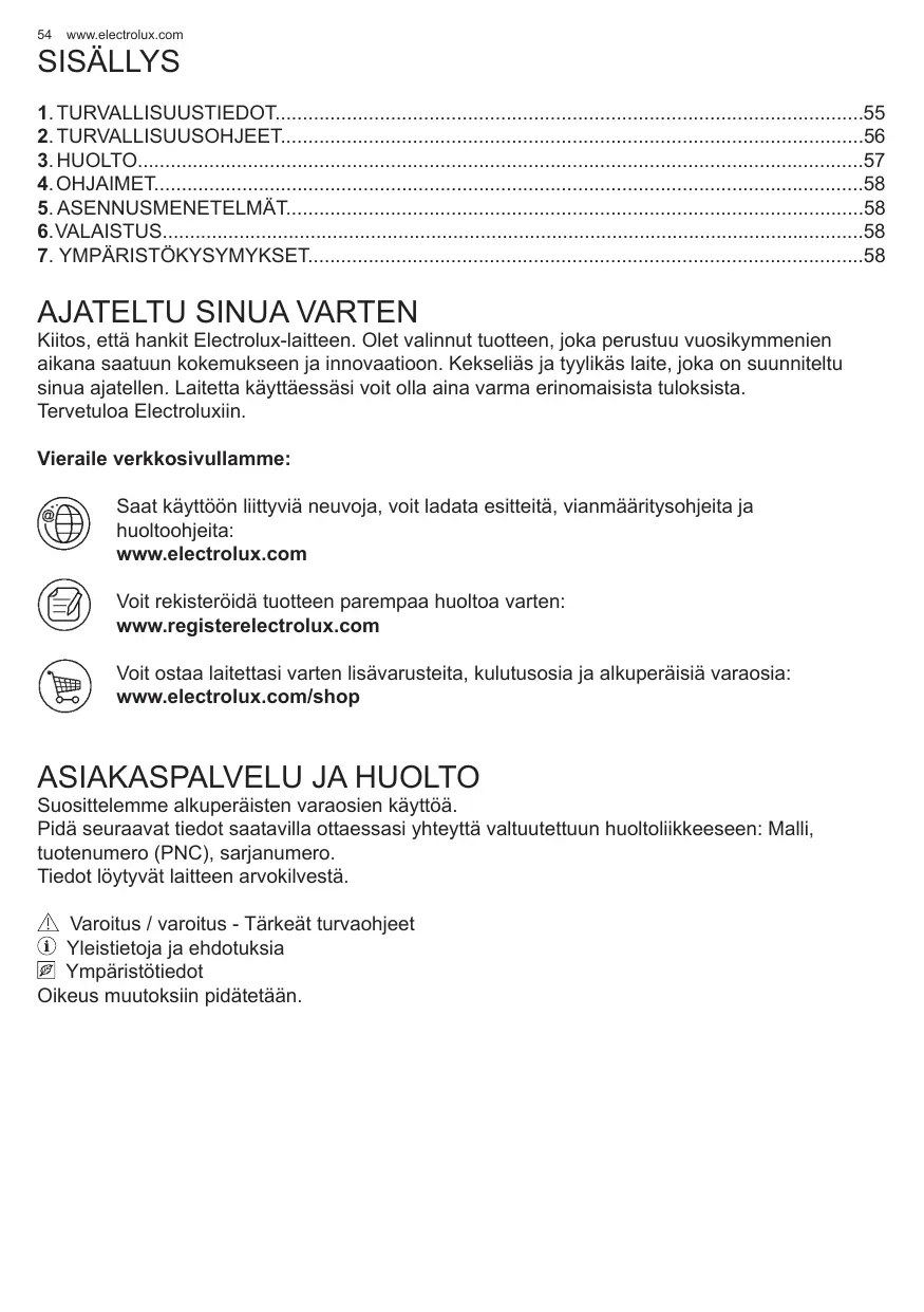 Kiitos, että hankit Electrolux-laitteen. Olet valinnut tuotteen, joka perustuu vuosikymmenien aikana saatuun kokemukseen ja innovaatioon. Kekseliäs ja tyylikäs laite, joka on suunniteltu sinua ajatellen. Laitetta Käyttäessäsi voit olla aina varma erinomaisista tuloksista. Tervetuloa Electroluxiin. Vieraile verkkosivullamme: Saat käyttôôn liittyviä neuvoja, voit ladata esitteitä, vianmääritysohjeita ja huoltoohjeita: www.electrolux.com Voit rekisterôidà tuotteen parempaa huoltoa varten: www.registerelectrolux.com Voit ostaa laitettasi varten lisävarusteita, kulutusosia ja alkuperäisiä varaosia: www.electrolux.com/shop