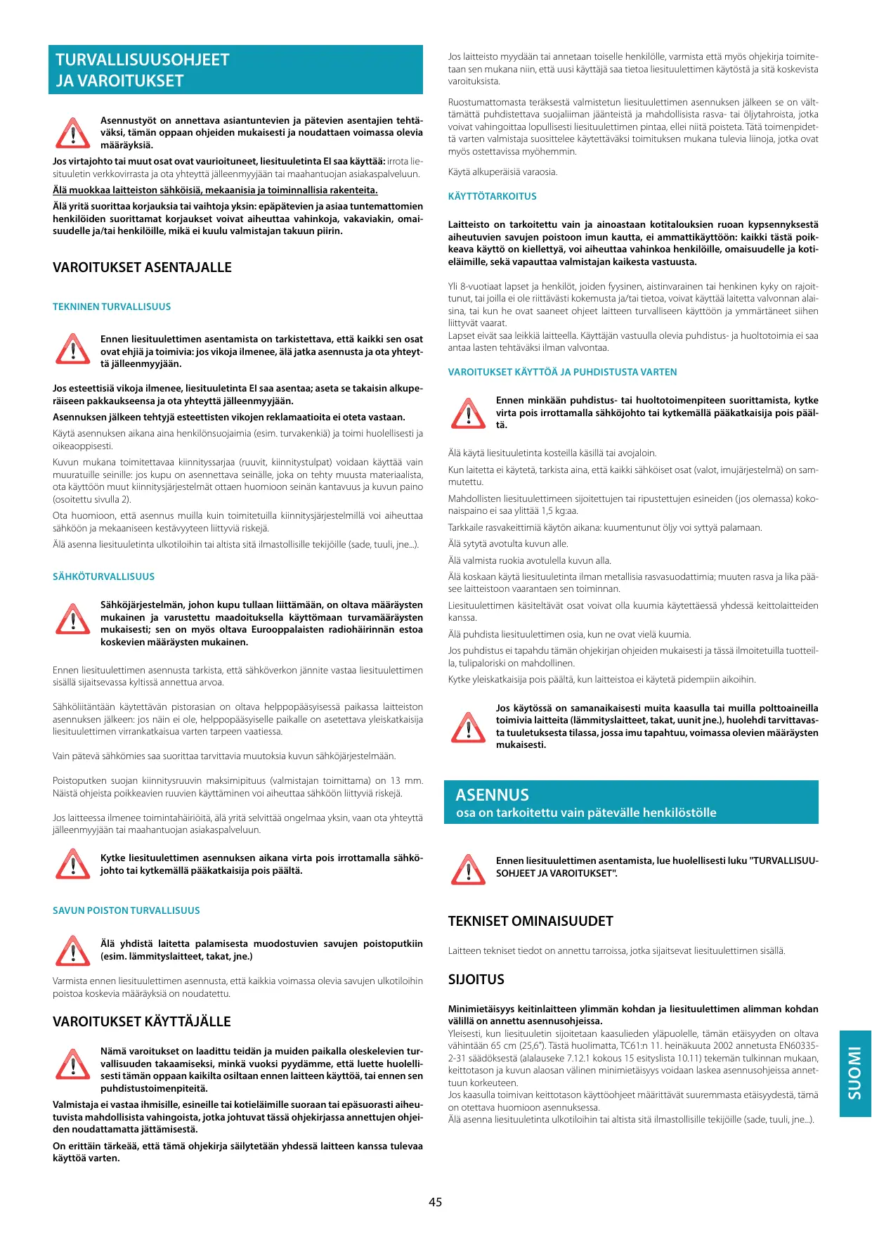 Jos virtajohto tai muut osat ovat vaurioituneet, liesituuletinta El saa käyttää: irrota lie sue verdouirast Je ot ht Bllenmyyhän tal maahantuajan akaspahehuun Asennustyôt on annettava asiantuntevien ja pätevien asentajien tehtä- äksi, tämän oppaan ohjeiden mukaisesti ja noudattaen voimassa olevia määräyksiä. tuntemattomien koja, vaka suudelle ja/tai henkilëille, mikä ei kuulu valmistajan takuun piirin. VAROITUKSET ASENTAJALLE TEKNINEN TURVALLISUUS