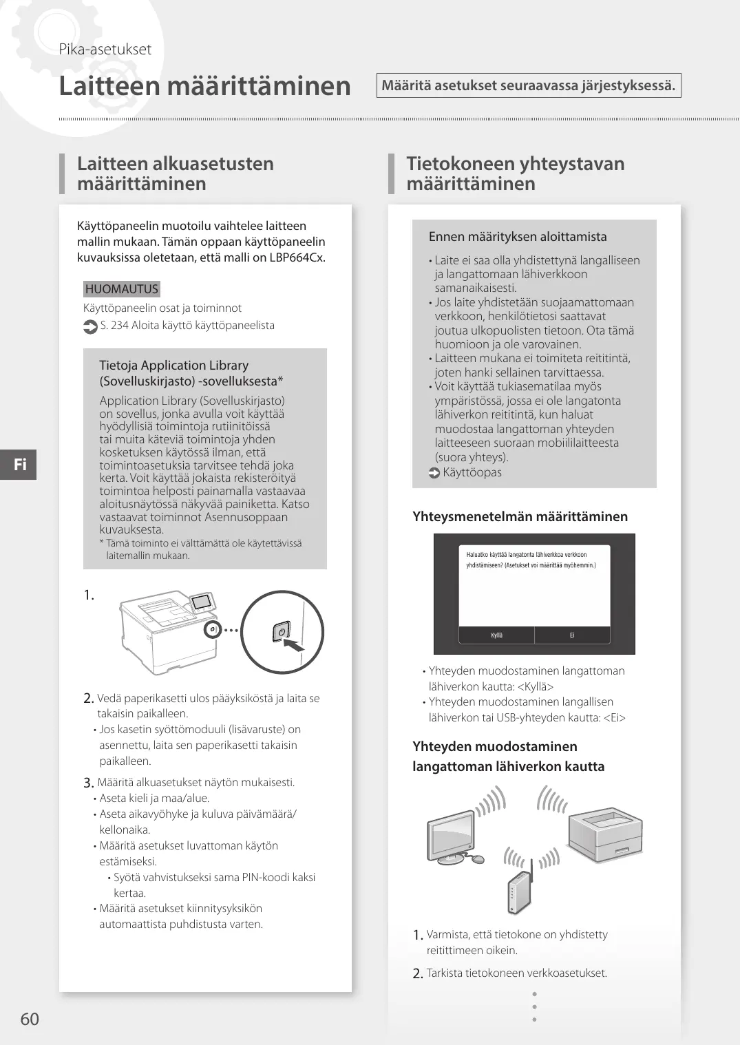 (Bibliothèque d'applications)* Application Library (Bibliothèque d'applications) vous permet d'utiliser des raccourcis associés à des boutons 1 touche pour les fonctions fréquemment utilisées, pour ne pas avoir à refaire tous les réglages correspondant à chaque utilisation de ces fonctions. Vous pouvez accéder à chaque fonction enregistrée en appuyant sur le bouton correspondant affiché sur l'écran d'accueil. Pour une description de chaque fonction, consultez le guide de configuration. Configuration de la méthode de connexion à un ordinateur Avant de commencer la configuration • Il n'est pas possible de connecter l'appareil à la fois à un réseau sans fil et à un réseau filaire. • Faites attention, si l'appareil est connecté à un réseau non sécurisé, vos données personnelles peuvent être divulguées à un tiers. • L'appareil n'est pas livré avec un routeur. Vous devez vous en procurer un. • Même dans un environnement sans routeur de réseau sans fil, vous pouvez utiliser le mode Point d'accès pour établir une connexion sans fil entre l'imprimante et votre appareil mobile (connexion directe). Guide de l'utilisateur