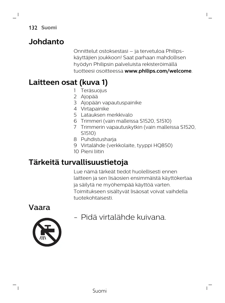 Teräsuojus Ajopää Ajopään vapautuspainike Virtapainike Latauksen merkkivalo Trimmeri (vain malleissa S1520, S1510) Trimmerin vapautuskytkin (vain malleissa S1520, S1510) 8 Puhdistusharja 9 Virtalähde (verkkolaite, tyyppi HQ850) 10 Pieni liitin