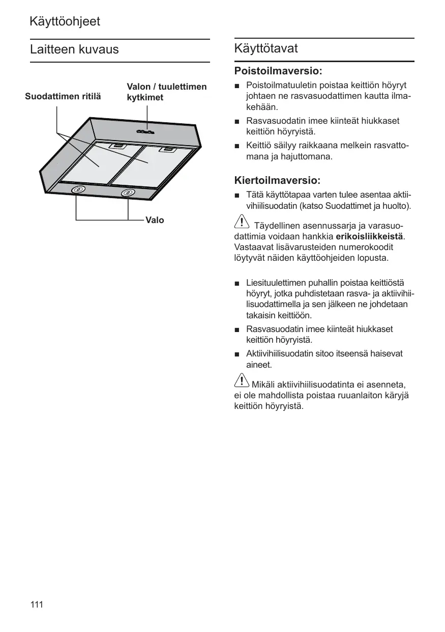- Poistoilmatuuletin poistaa keittiön hóryt johtaen ne rasvasuodattimen kautta ilmakehaan.