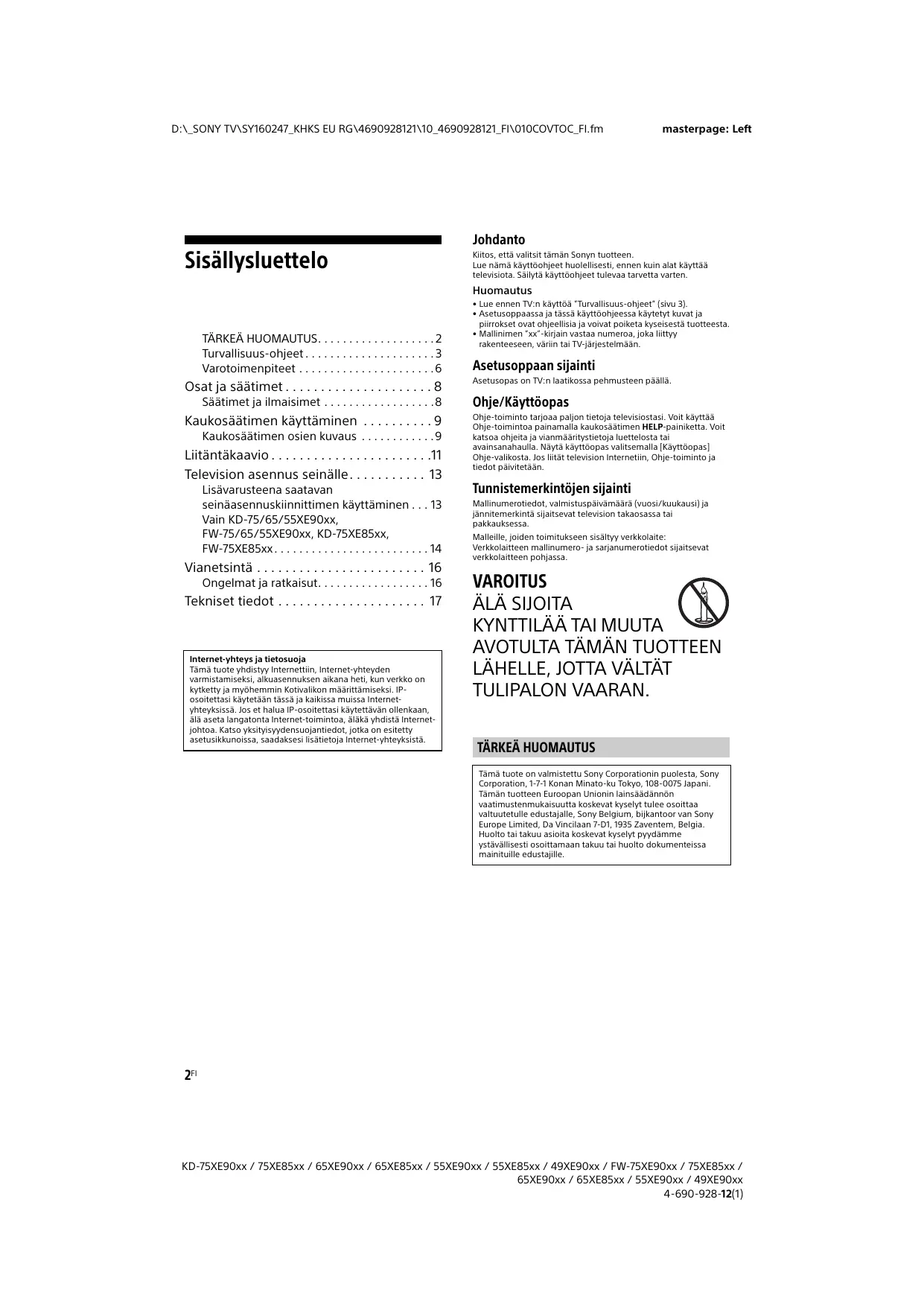 - Joissakin televisioissa voi olla toimintoja, jotka toimiakseen edellyttävät television olevan valmiustilassa. 5FI KD-75XE90xx / 75XE85xx / 65XE90xx / 65XE85xx / 55XE90xx / 55XE85xx / 49XE90xx / FW-75XE90xx / 75XE85xx / 65XE90xx / 65XE85xx / 55XE90xx / 49XE90xx 4-690-928-12(1) D:\_SONY TV\SY160247_KHKS EU RG\4690928121\10_4690928121_FI\010COVTOC_FI.fm Lasten turvallisuus