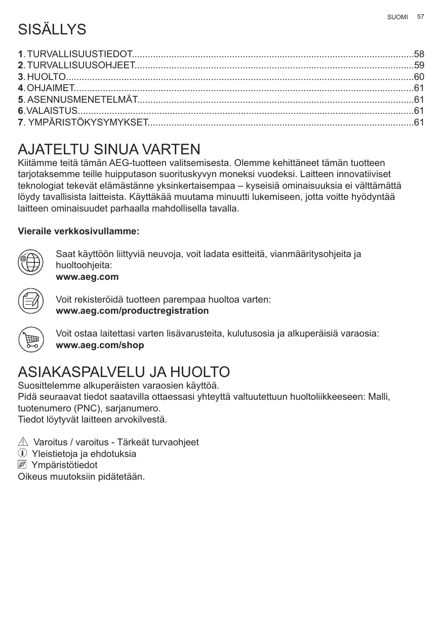 AJATELTU SINUA VARTEN Kiitämme teitä tämän AEG-tuotteen valitsemisesta. Olemme kehittäneet tämän tuotteen tarjotaksemme teille huipputason suorituskyvyn moneksi vuodeksi. Laitteen innovatiiviset teknologiat tekevät elämästänne yksinkertaisempaa – kyseisiä ominaisuuksia ei välttämättä löydy tavallisista laitteista. Käyttäkää muutama minuutti lukemiseen, jotta voitte hyödyntää laitteen ominaisuudet parhaalla mahdollisella tavalla. Vieraile verkkosivullamme: Saat käyttöön liittyviä neuvoja, voit ladata esitteitä, vianmääritysohjeita ja huoltoohjeita: www.aeg.com Voit rekisteröidä tuotteen parempaa huoltoa varten: www.aeg.com/productregistration Voit ostaa laitettasi varten lisävarusteita, kulutusosia ja alkuperäisiä varaosia: www.aeg.com/shop