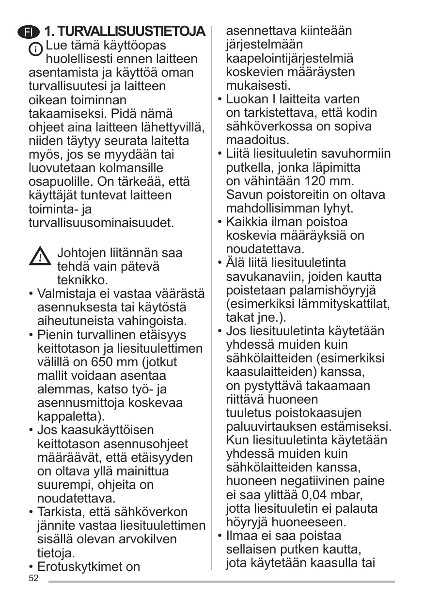 asennettava kiinteään järjestelmään kaapelointijärjestelmiä koskevien määräysten mukaisesti. Luokan I laitteita varten on tarkistettava, että kodin sähköverkossa on sopiva maadoitus. Liitä liesituuletin savuhormiin putkella, jonka läpimitta on vähintään 120 mm. Savun poistoreitin on oltava mahdollisimman lyhyt. Kaikkia ilman poistoa koskevia määräyksiä on noudatettava. Älä liitä liesituuletinta savukanaviin, joiden kautta poistetaan palamishöyryjä (esimerkiksi lämmityskattilat, takat jne.). Jos liesituuletinta käytetään yhdessä muiden kuin sähkölaitteiden (esimerkiksi kaasulaitteiden) kanssa, on pystyttävä takaamaan riittävä huoneen tuuletus poistokaasujen paluuvirtauksen estämiseksi. Kun liesituuletinta käytetään yhdessä muiden kuin sähkölaitteiden kanssa, huoneen negatiivinen paine ei saa ylittää 0,04 mbar, jotta liesituuletin ei palauta höyryjä huoneeseen. Ilmaa ei saa poistaa sellaisen putken kautta, jota käytetään kaasulla tai