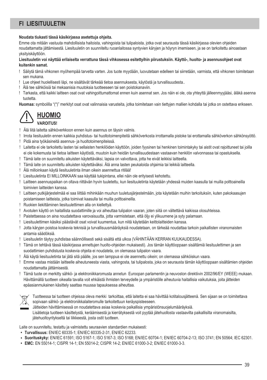 ! ! Cet appareil n’est pas prévu pour les enfants ou les personnes à capacités physiques, sensorielles ou mentales réduites ou manquant d’expérience et de connaissances. Elles ne pourront l’utiliser que sous la surveillance d'un adulte responsable de leur sécurité et après avoir été mises au courant de son fonctionnement. La hotte est prévue pour des adultes. Surveillez les enfants afin qu’ils ne jouent pas avec l’appareil ou avec ses commandes. Ne mettez jamais la hotte en marche si la grille n'est pas bien en place. Ne déposez AUCUN objet sur la hotte sauf si cela est expressément autorisé. Quand la hotte fonctionne en même temps que d'autres appareils à gaz ou autres combustibles, la cuisine doit disposer d'une ventilation suffisante. L'air aspiré par la hotte ne doit jamais être expulsé dans le conduit d’évacuation des fumées de combustion dégagées par des appareils fonctionnant au gaz ou autres combustibles. Il est formellement interdit de flamber les aliments sous la hotte. Évitez de laisser brûler une flamme nue sous la hotte, car cela peut endommager les filtres et provoquer un incendie. Surveillez vos fritures en permanence, car la graisse ou l’huile surchauffée peut prendre feu. Les parties accessibles de la hotte peuvent devenir assez chaudes quand les appareils de cuisson sont en marche. En ce qui concerne les mesures techniques de sécurité pour l'évacuation des fumées, respectez strictement les réglementations et normes en vigueur dans votre pays. La hotte doit être régulièrement nettoyée, aussi bien à l'intérieur qu'à l'extérieur (AU MOINS UNE FOIS PAR MOIS), et ceci en respectant les instructions d'entretien fournies dans ce manuel. Le non-respect des consignes concernant le nettoyage de la hotte ainsi que le remplacement et le nettoyage des filtres peut entraîner un risque d'incendie. Afin d'éviter tout risque de choc électrique, n'utilisez pas la hotte si les lampes ne sont pas bien en place. Nous déclinons toute responsabilité pour tout dysfonctionnement, dommage ou incendie résultant du non-respect des consignes figurant dans cette notice. Ce symbole figure sur le produit ou sur son emballage en application de la directive européenne 2002/96/CE sur les Déchets d’Équipement Électrique et Électronique (DEEE). Cette directive sert de règlement cadre à la reprise, au recyclage et à la valorisation des appareils usagés dans toute l’Europe. Ce produit doit donc faire l’objet d’une collecte sélective. Lorsque vous ne l’utiliserez plus, remettez-le à un service de ramassage spécialisé ou à une déchèterie qui traite les DEEE ; vous contribuerez ainsi à éviter des conséquences néfastes pour la santé et l'environnement. Pour tout renseignement sur la mise au rebut et le recyclage de ce produit, veuillez contacter la mairie ou le service de la propreté de votre commune, ou encore le magasin dans lequel vous l'avez acheté.