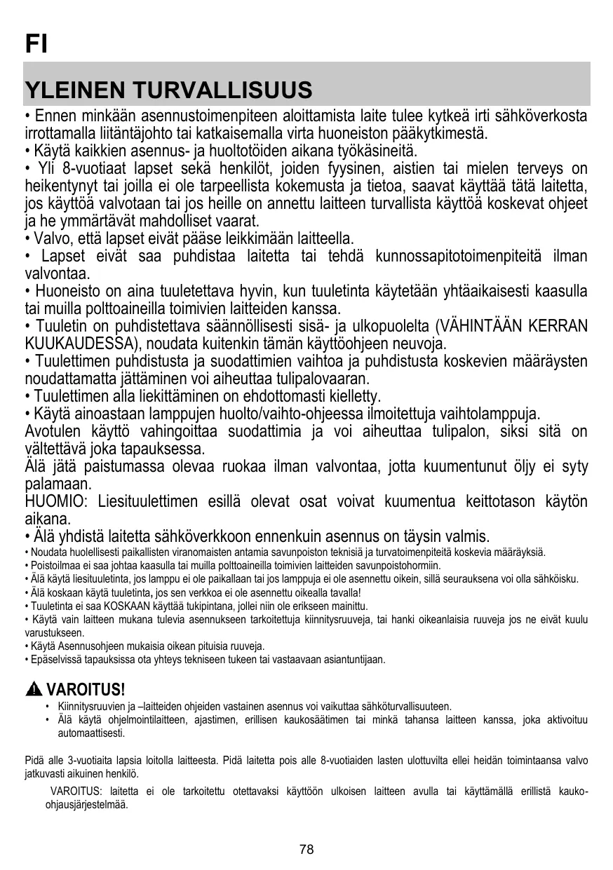 • Les enfants ne doivent pas jouer avec l’appareil. • Le nettoyage et l’entretien par l’usager ne doivent pas être effectués par des enfants sans surveillance. • La pièce doit avoir une aération suffisante lorsque la hotte est utilisée conjointement avec d'autres appareils fonctionnant au gaz ou autres combustibles. • La hotte doit être régulièrement nettoyée à la fois à l'intérieur et à l'extérieur (AU MOINS UNE FOIS PAR MOIS); cela devrait se faire en conformité avec les instructions d'entretien. Le non respect des instructions expressément fournies concernant le nettoyage de la hotte et des filtres peut provoquer des risques d'incendie. • Ne pas flamber d’aliments sous la hotte. • Pour le remplacement de la lampe, utilisez uniquement le type de lampe spécifié dans la section remplacement/maintenance lampe dans ce manuel. L'utilisation d'une flamme nue est dommageable pour les filtres et peut causer un incendie, par conséquent, il est déconseillé de l'utiliser. La friture doit être faite avec soin afin de s’assurer que l’huile surchauffée ne prenne pas feu. AVERTISSEMENT: Lorsque la table de cuisson est en fonctionnement, les parties accessibles de la hotte peuvent devenir très chaudes. • Ne pas brancher l'appareil au réseau électrique avant que l'installation ne soit complètement terminée. • En ce qui concerne les mesures techniques et de sécurité à prendre pour l'évacuation des fumées, respectez strictement les dispositions des règlements locales. • L’air ne doit pas être envoyé dans un conduit utilisé pour évacuer les fumées d’appareils utilisant du gaz ou un autre combustible. • Ne pas utiliser ou laisser la hotte sans les lampes correctement montées, car un éventuel risque de choc électrique est possible. • N’utilisez jamais la hotte sans la grille montée correctement! • La hotte ne doit JAMAIS être utilisée comme une surface d'appui, sauf indication expresse. • Utilisez uniquement les vis de fixation fournies avec le produit pour l'installation, ou, si non fournies, acheter le type correct de vis. • Utilisez la longueur correcte pour les vis qui sont identifiées dans le Guide d'installation. • En cas de doute, consultez votre centre de service agréé ou du personnel qualifié.