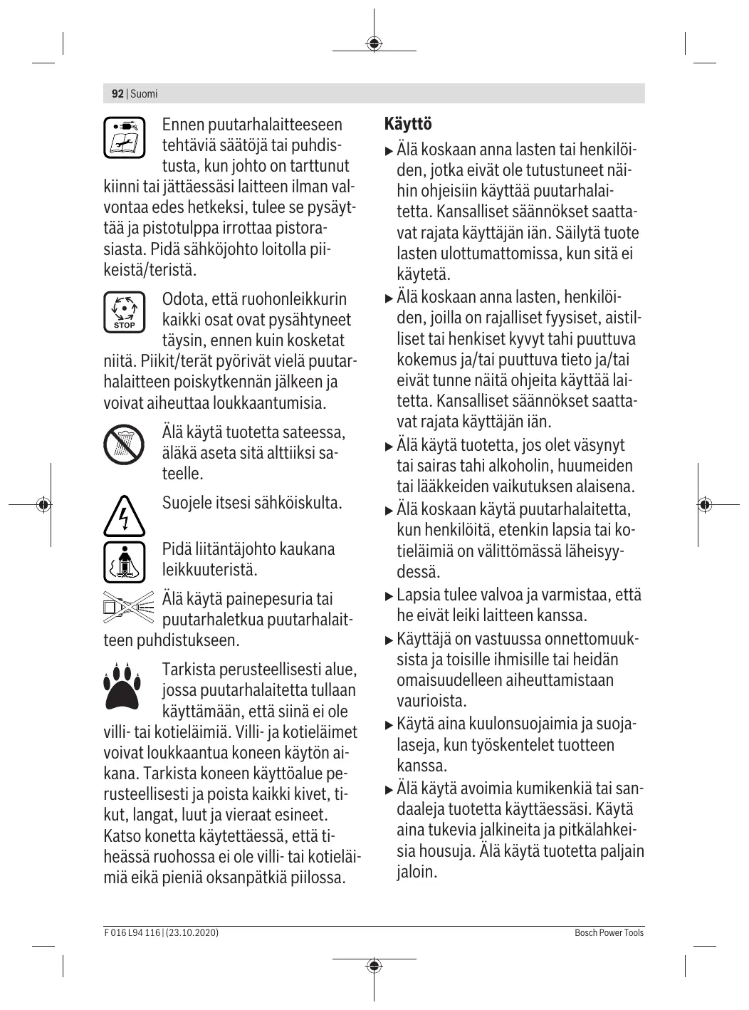 Instrucciones de seguridad ¡Atención! Lea detenidamente las siguientes instrucciones. Familiarícese con los elementos de manejo y el uso reglamentario del producto. Preste atención a que no sean lesionadas por cuerpos extraños proyectados las personas situadas cerca. Advertencia: Mantenga una separación de seguridad respecto al producto en funcionamiento. Atención: No toque las cuchillas en funcionamiento. Las cuchillas están muy afiladas. Tenga cuidado de no cercenarse los dedos de los pies y de las manos. Desconecte el aparato para jardín y saque el enchufe de la red antes de realizar un ajuste, al limpiarlo, si se hubiese enganchado el cable, o siempre que deje desatendido el aparato para jardín, incluso durante un tiempo breve. Mantenga alejado el cable de red de las púas/cuchillas. Espere a que todas las piezas del aparato para jardín se hayan detenido por completo antes de tocarlas. Al desconectar el F 016 L94 116 | (23.10.2020)