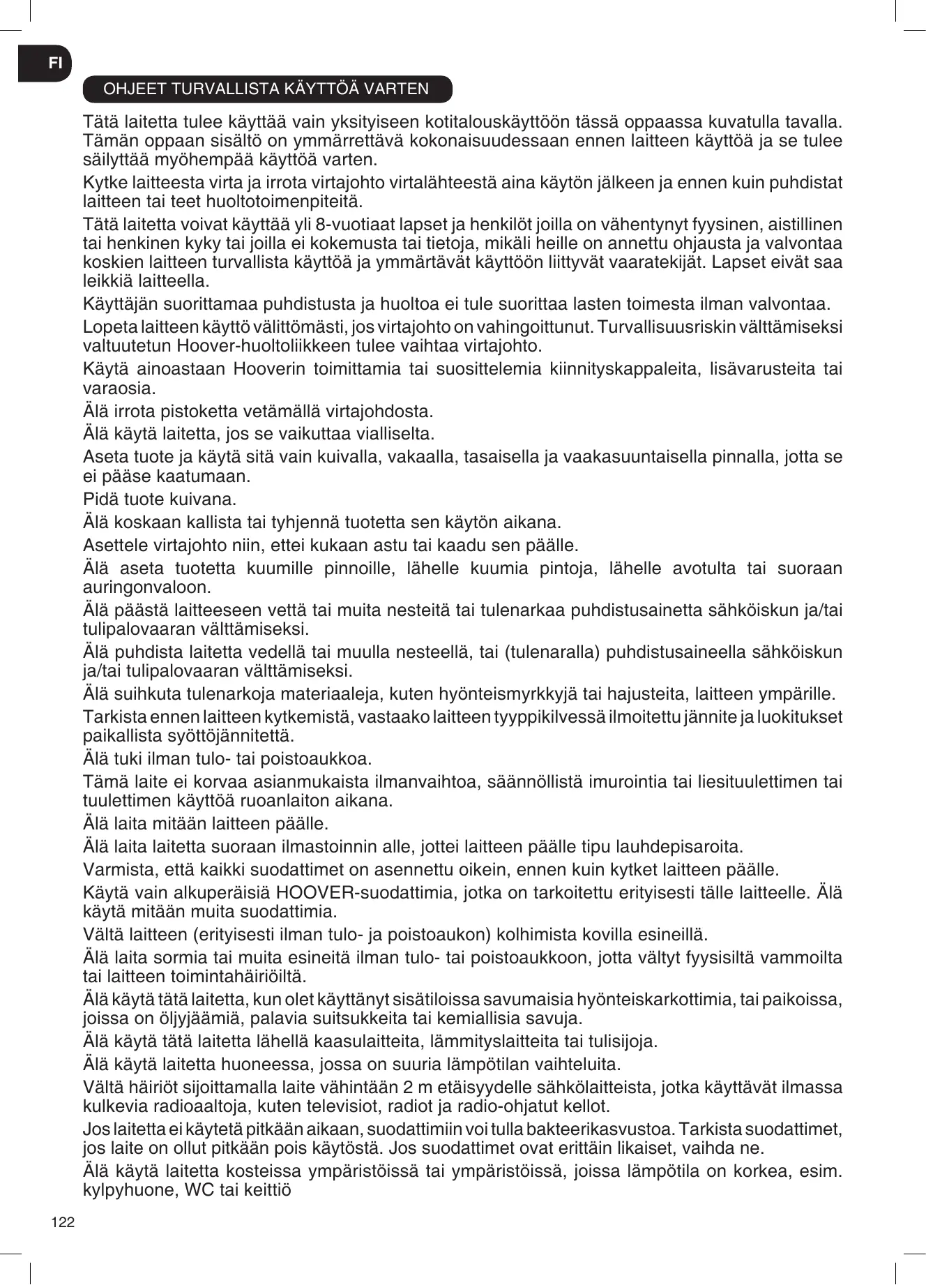 Le nettoyage et l’entretien ne devraient pas être effectués par des enfants sans supervision. Si le cordon d’alimentation est endommagé, arrêtez immédiatement d’utiliser l’appareil. Pour éviter les risques d’accident, un réparateur HOOVER agréé doit remplacer le cordon d’alimentation. N’utilisez que les accessoires, consommables ou pièces détachées recommandés ou fournis par HOOVER. Ne débranchez pas l’appareil en tirant le cordon d’alimentation. Ne continuez pas à utiliser votre appareil s’il semble défectueux. Placez et utilisez l’appareil uniquement sur une surface sèche, stable et à l’horizontale afin d’éviter le basculement. Gardez l’appareil sec. N’inclinez ou ne videz jamais l’appareil pendant le fonctionnement. Posez le cordon d’alimentation de façon à ce que personne ne le piétine ou n’y trébuche. Ne placez pas l’appareil sur des surfaces chaudes, près de surfaces chaudes, près de feux ouverts ou directement exposé aux rayons du soleil. Ne laissez pas que de l’eau ou tout autre liquide ou détergent inflammable pénètre dans l’appareil pour éviter tout risque d’électrocution et/ou d’incendie. Ne nettoyez pas l’appareil avec de l’eau, tout autre liquide ou un détergent (inflammable) pour éviter tout risque d’électrocution et/ou d’incendie. Ne vaporisez pas de produits inflammables comme des insecticides ou des parfumeurs autour de l’appareil. Vérifiez si la tension et les puissances indiquées sur l’étiquette de l’appareil correspondent à la tension d’alimentation locale avant de brancher l’appareil. Ne bloquez pas l’entrée ou la sortie de l’air. Cet appareil ne remplace pas une ventilation correcte, un nettoyage régulier avec l’aspirateur ou l’utilisation d’une hotte aspirante ou d’un ventilateur pendant que vous cuisinez. Ne placez rien sur l’appareil. Ne placez pas l’appareil directement en dessous d’un climatiseur pour éviter que le condensat dégouline dans l’appareil. Assurez-vous que les filtres soient convenablement montés avant d’allumer l’appareil. Utilisez uniquement les filtres originaux HOOVER spécifiques pour cet appareil. N’utilisez pas d’autres filtres. Évitez de frapper contre l’appareil (l’entrée et la sortie de l’air en particulier) avec des objets durs. N’enfilez pas vos doigts ou des objets dans la sortie de l’air ou dans l’entrée de l’air pour éviter des blessures ou un dysfonctionnement de l’appareil. N’utilisez pas cet appareil quand vous avez utilisez des répulsifs pour insectes à fumée intérieure ou dans des endroits avec des résidus d’huile, de l’encens brûlant ou des fumées chimiques. N’utilisez pas cet appareil près d’appareils à gaz, de dispositifs chauffants ou des cheminées. N’utilisez pas l’appareil dans une chambre avec des changements de températures importants. Pour éviter les interférences, placez l’appareil au moins à 2 m de tout appareil électrique qui utilise les ondes radio aériennes comme les TV, les radios et les horloges radio-pilotées. Quand l’appareil n’est pas utilisé pendant longtemps, des bactéries peuvent proliférer sur les 14