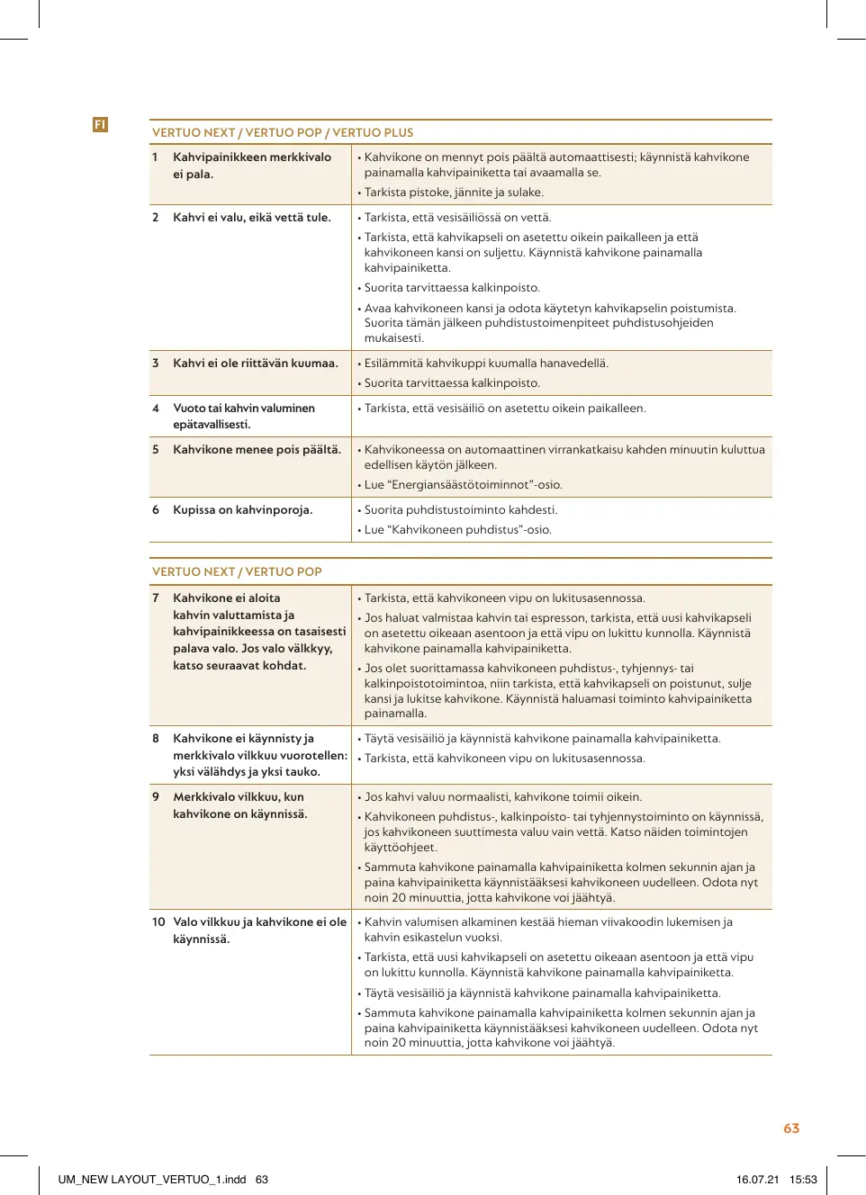 - Kalkinpoisto on tarpeen: kahvia voidaan valmistaa tämän merkkivaloilmoituksen jälkeen vain muutaman kerran ennen kuin kalkinpoisto on pakollista suorittaa. VERTUO PLUS 7b Kahvikoneessa on kahvivuoto.