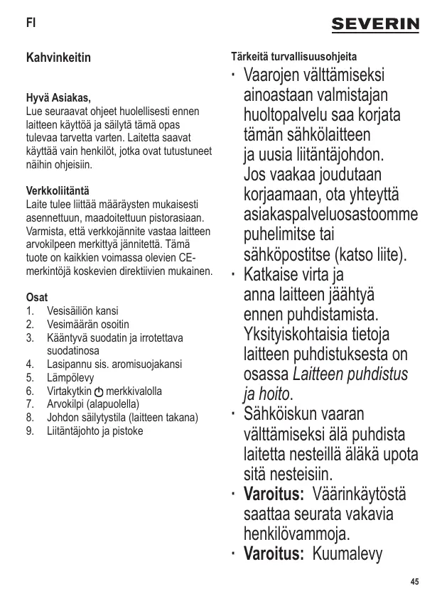 Kahvinkeitin Hyvä Asiakas, Lue seuraavat ohjeet huolellisesti ennen laitteen käyttöä ja säilytä tämä opas tulevaa tarvetta varten. Laitetta saavat käyttää vain henkilöt, jotka ovat tutustuneet näihin ohjeisiin. Verkkoliitäntä Laite tulee liittää määräysten mukaisesti asennettuun, maadoitettuun pistorasiaan. Varmista, että verkkojännite vastaa laitteen arvokilpeen merkittyä jännitettä. Tämä tuote on kaikkien voimassa olevien CEmerkintöjä koskevien direktiivien mukainen. Osat