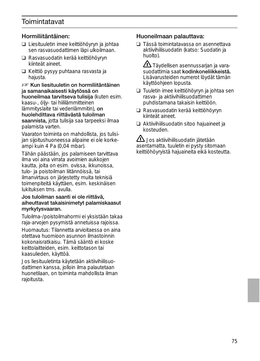 ❑ Ce filtre retient les particules grasses solides en suspension dans les buées de cuisson. ❑ Les particules grasses ne se déposent plus dans la cuisine, les odeurs de cuisson disparaissent. D Si la hotte évacue l'air à l'extérieur et si le logement comporte des moyens de chauffage (tels par ex. des appareils de chauffage au gaz, au fuel ou au charbon, chauffe-eau instantanés ou à accumulation) raccordés à une cheminée, veiller impérativement à ce que l'apport d'air soit suffisant pour assurer la marche du chauffage à combustion. Un fonctionnement sans risque est possible si la dépression dans le local où le foyer de chauffage est implanté ne dépasse pas 4 Pascals (0,04 mbars).On y parvient en présence d'ouvertures non obturables ménagées par ex. dans les portes, fenêtres et en association avec des ventouses télescopiques d'admission/ évacuation de l'air à travers la maçonnerie ou par d'autres mesures techniques telles qu'un verrouillage réciproque ou assimilé permettant à l'air d'affluer pour assurer la combustion. En cas d'afflux d'air insuffisant, risque d'intoxication par réaspiration des gaz de combustion. La présence d'une ventouse télescopique d'apport et d'évacuation d'air ne suffit pas à assurer le respect de la valeur limite. Remarque: lors de l'évaluation de la situation, toujours tenir compte de l'ensemble des moyens d'aération du logement. Cette règle ne vaut généralement pas si vous utilisez des appareils de cuisson (table de cuisson et cuisinière à gaz). Si la hotte recycle l'air aspiré au moyen d'un filtre au charbon actif, son fonctionnement ne s'assortit d'aucune restriction.