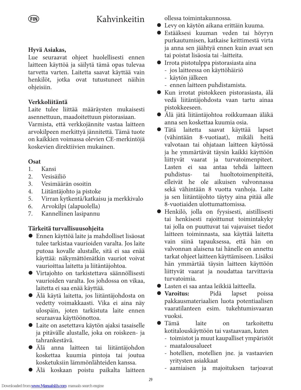 Tärkeitä turvallisuusohjeita Ennen käyttöä laite ja mahdolliset lisäosat tulee tarkistaa vaurioiden varalta. Jos laite putoaa kovalle alustalle, sitä ei saa enää käyttää: näkymättömätkin vauriot voivat vaurioittaa laitetta ja liitäntäjohtoa. Virtajohto on tarkistettava säännöllisesti vaurioiden varalta. Jos johdossa on vikaa, laitetta ei saa enää käyttää. Älä käytä laitetta, jos liitäntäjohdosta on vedetty voimakkaasti. Vika ei aina näy ulospäin, joten tarkistuta laite ennen seuraavaa käyttöönottoa. Laite on asetettava käytön ajaksi tasaiselle ja pitävälle alustalle, joka on roiskeen- ja tahrankestävä. Älä anna laitteen tai liitäntäjohdon koskettaa kuumia pintoja tai joutua kosketuksiin lämmönlähteiden kanssa. Älä koskaan poistu paikalta laitteen Downloaded from www.Manualslib.com manuals search engine majatalot. Jos laite vahingoittuu väärinkäytön seurauksena tai siksi, että annettuja ohjeita ei ole noudatettu, valmistaja ei vastaa aiheutuneista vahingoista. Turvallisuusmääräykset vaativat, että sähkölaitteen saa korjata ja liitäntäjohdon uusia ainoastaan sähköalan ammattilainen. Näin vältytään vaarallisilta tilanteilta. Jos laite vaatii huoltoa tai korjausta, lähetä se huoltoliikkeeseemme. Osoitteen löydät tämän käyttöohjeen liitteestä. Jokaista normaalin kokoista kuppia (125 ml) varten tarvitaan noin 6 g (=1½ - 2 tl) hienoksi jauhettua kahvia. Sulje sitten kansi. – Lasipannun valmistelu: Kiinnitä pannuun kansi ja laita pannu sitten kuumalevyn päälle. Kun pannu on oikein paikoillaan, kansi estää suodatinpitimen tippalukkomekanismin toiminnan kahvin valmistuksen aikana. – Kahvin valmistuksen aloitus: Työnnä pistoke pistorasiaan ja käännä virta päälle laitteen virrankatkaisimesta. Suodatusjakso alkaa ja vesi virtaa suodattimen läpi. – Lasipannun poistaminen: Odota, kunnes vesi on poistunut suodattimesta ennen kuin poistat pannun keittimestä. – Kahvinkeittimen kytkeminen pois toiminnasta: Kahvin voi pitää lämpimänä pannussa jättämällä pannun keittimen levylle. Levy pysyy lämpimänä kunnes laite sammutetaan. Katkaise virta laitteesta aina käytön jälkeen ja irrota pistotulppa pistorasiasta. Ennen käyttöä Ennen kuin valmistat kahvia ensimmäisen kerran, käytä keitintä kahdesta kolmeen kertaan täydellä vesimäärällä ilman kahvia. Tee samoin jos laite on ollut pitkään käyttämättä ja kalkinpoiston jälkeen. Yleistä – Vesisäiliössä lasipannussa täyttömerkinnät, joiden avulla säiliö on helppo täyttää oikealla vesimäärällä. Vasemmanpuoleinen merkintä tarkoitettu normaalinkokoisille, noin 125 ml:n kupeille ja oikeanpuoleinen pienemmille kupeille. Varmista, ettet ylitä veden enimmäismäärän merkkiä. Jos keität kahvia useita kertoja peräkkäin, katkaise jokaisen keittokerran jälkeen keittimestä virta ja anna sen jäähtyä noin 5 minuuttia. Tärkeää: Jos laiteeseen kaadetaan vettä pian edellisen keittokerran jälkeen, vesiaukosta purkautuva kuuma vesi tai höyry voi aiheuttaa palovammavaaran. Kalkin poisto Kaikista kuumaa vettä käyttävistä kodinkoneista on aika ajoin poistettava kalkkisakkautumat, jotta laitteen toiminta ei kärsi. Toimenpiteen toistotiheys riippuu veden laadusta (kalkkipitoisuus), sekä siitä, kuinka usein laitetta käytetään. Kaikki takuut raukeavat, jos laitteeseen tulee vika riittämättömän kalkinpoiston vuoksi. Jos suodatusjakso pitenee ja kahvinkeitin alkaa toimia kovin äänekkäästi, syynä on todennäköisesti kahvinkeittimeen syntynyt kattilakivi. Kovin paksuja kalkkisakkautumia on erittäin vaikea poistaa voimakkaillakin aineilla. Kalkki voi aiheuttaa myös keittimen vuotamista. Valmistaja suosittelee, että kattilakiven poisto suoritetaan aina 30-40 suodatusjakson välein. Toimenpiteen voi suorittaa etikkaliuoksella: Kahvin valmistus – Veden lisääminen: Avaa kansi ja lisää säiliöön haluamasi määrä vettä. – Paperisuodattimen asetus: Aseta suodatinpitimeen kokoa 4 oleva paperisuodatin. Taivuta ensin suodattimen rei’itetyt sivut. – Kahvijauheen lisääminen: Downloaded from www.Manualslib.com manuals search engine – Sekoita 2 ruokalusikallista etikkaa 250 ml:aan kylmää vettä. – Kaada seos keittimen vesisäiliöön, laita paperisuodatin suodatinpitimeen ilman kahvia Kahvin valmistus -osassa kuvatulla tavalla ja anna keittimen käydä läpi yksi suodatusjakso. Toista toimenpide tarpeen vaatiessa. Älä hengitä kalkinpoiston aikana syntyviä etikkahöyryjä ja varmista riittävä tuuletus. – Puhdista kahvinkeitin kattilakiven poiston jälkeen käymällä suodatusjakso lävitse 2–3 kertaa puhtaalla vedellä. – Älä kaada kalkinpoistoainetta emaloituihin astianpesualtaisiin. Suomessa kulloinkin alalla voimassa olevien takuuehtojen mukaan. Mikäli laitetta käytetään väärin, käyttöohjeen vastaisesti tai huolimattomasti, vastuu syntyvistä esine- ja henkilövahingoista lankeaa laitteen käyttäjälle. Tämä takuu ei vaikuta lakimääräisiin oikeuksiin eikä mihinkään muihin kansallisen lainsäädännön säätämiin tuotteiden ostoa koskeviin laillisiin kuluttajaoikeuksiin, joita tuotteen hankkijalla on. Valmistuttaja: Severin Elektrogeräte GmbH, Saksa Maahantuoja: Oy Harry Marcell Ab PL 63, 01511 VANTAA Puh (09) 870 87860 Fax (09) 870 87801 www.harrymarcell.fi asiakaspalvelu@harrymarcell.fi Laitteen puhdistus ja huolto Katkaise virta ja anna laitteen jäähtyä ennen puhdistamista. Sähköturvallisuussyistä laitetta ei saa puhdistaa vedellä eikä upottaa veteen. Laite puhdistetaan kosteahkolla rievulla ja miedolla pesuaineliuoksella. Kuivaa hyvin. Älä käytä hankaavia tai karkeita puhdistusaineita. – Poista käytetty kahvijauhe avaamalla kansi ja poistamalla suodatinpidin. Poista kahvisuodatin ja kahviporot (luonnonaineena kahviporot soveltuvat kompostoitavaksi). Huuhtele suodatinpidin, aseta takaisin paikalleen ja sulje kansi. – Lasipannun voi puhdistaa 