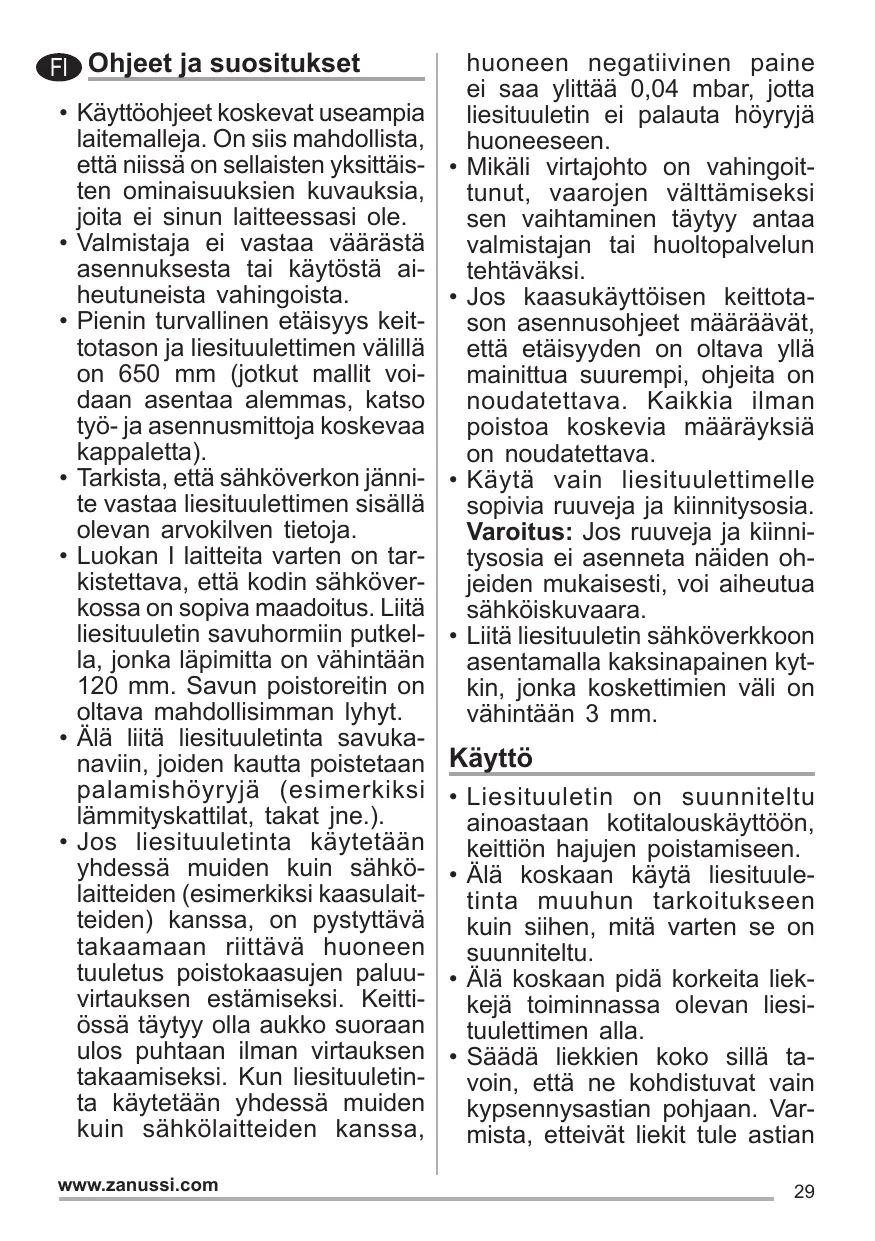 éviter tout risque d’accident. Si les instructions d’installation du plan de cuisson à gaz spécifient une distance supérieure à celle indiquée ci-dessus, veuillez impérativement en tenir compte. Toutes les normes concernant l’évacuation de l’air doivent être respectées. Utiliser exclusivement des vis et des petites pièces du type adapté pour la hotte. Attention: toute installation des vis et des dispositifs de fixation non conforme aux présentes instructions peut entraîner des risques de décharges électriques. Brancher la hotte à l’alimentation de secteur avec un interrupteur bipolaire ayant une ouverture des contacts d’au moins 3 mm. www.zanussi.com