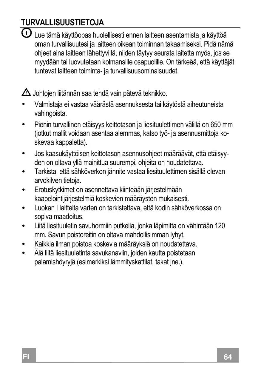 Compruebe que la tensión de red coincide con la indicada en la placa de características del interior de la campana. Los dispositivos de desconexión deben instalarse en la instalación fija de acuerdo con las regulaciones para sistemas de cableado. Para los aparatos de la clase I, compruebe que el suministro de corriente eléctrica de la casa tiene una conexión a tierra adecuada. Conecte la campana a la chimenea con un tubo de un diámetro mínimo de 120 mm. El trayecto de humos debe ser lo más corto posible. Deben observarse todas las normas relativas al escape de aire. No conecte la campana extractora a los conductos de humos de combustión (p. ej. calderas, chimeneas, etc.).
