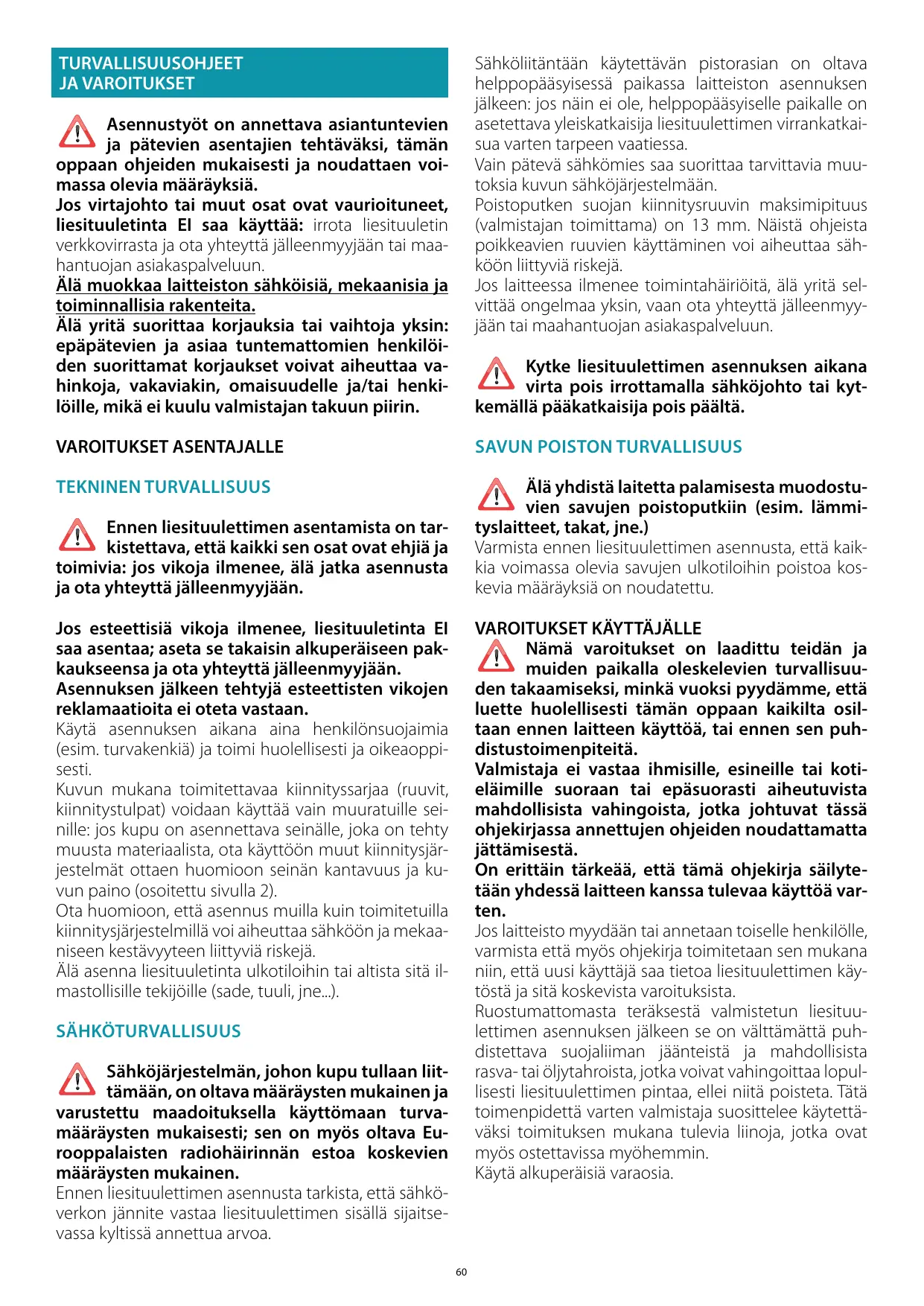 Nämä varoitukset on laadittu teidän ja muiden paikalla oleskelevien turvallisuuden takaamiseksi, minkä vuoksi pyydämme, että luette huolellisesti tämän oppaan kaikilta osiltaan ennen laitteen käyttöä, tai ennen sen puhdistustoimenpiteitä. Valmistaja ei vastaa ihmisille, esineille tai kotieläimille suoraan tai epäsuorasti aiheutuvista mahdollisista vahingoista, jotka johtuvat tässä ohjekirjassa annettujen ohjeiden noudattamatta jättämisestä. On erittäin tärkeää, että tämä ohjekirja säilytetään yhdessä laitteen kanssa tulevaa käyttöä varten. Jos laitteisto myydään tai annetaan toiselle henkilölle, varmista että myös ohjekirja toimitetaan sen mukana niin, että uusi käyttäjä saa tietoa liesituulettimen käytöstä ja sitä koskevista varoituksista. Ruostumattomasta teräksestä valmistetun liesituulettimen asennuksen jälkeen se on välttämättä puhdistettava suojaliiman jäänteistä ja mahdollisista rasva- tai öljytahroista, jotka voivat vahingoittaa lopullisesti liesituulettimen pintaa, ellei niitä poisteta. Tätä toimenpidettä varten valmistaja suosittelee käytettäväksi toimituksen mukana tulevia liinoja, jotka ovat myös ostettavissa myöhemmin. Käytä alkuperäisiä varaosia. Jos esteettisiä vikoja ilmenee, liesituuletinta EI saa asentaa; aseta se takaisin alkuperäiseen pakkaukseensa ja ota yhteyttä jälleenmyyjään. Asennuksen jälkeen tehtyjä esteettisten vikojen reklamaatioita ei oteta vastaan. Käytä asennuksen aikana aina henkilönsuojaimia (esim. turvakenkiä) ja toimi huolellisesti ja oikeaoppisesti. Kuvun mukana toimitettavaa kiinnityssarjaa (ruuvit, kiinnitystulpat) voidaan käyttää vain muuratuille seinille: jos kupu on asennettava seinälle, joka on tehty muusta materiaalista, ota käyttöön muut kiinnitysjärjestelmät ottaen huomioon seinän kantavuus ja kuvun paino (osoitettu sivulla 2). Ota huomioon, että asennus muilla kuin toimitetuilla kiinnitysjärjestelmillä voi aiheuttaa sähköön ja mekaaniseen kestävyyteen liittyviä riskejä. Älä asenna liesituuletinta ulkotiloihin tai altista sitä ilmastollisille tekijöille (sade, tuuli, jne...).