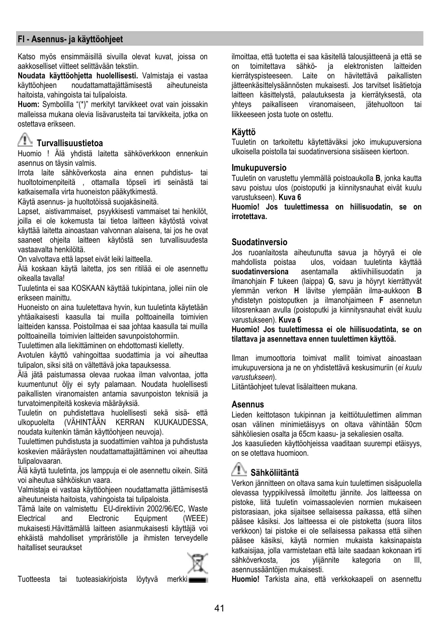 Turvallisuustietoa Huomio ! Älä yhdistä laitetta sähköverkkoon ennenkuin asennus on täysin valmis. Irrota laite sähköverkosta aina ennen puhdistus- tai huoltotoimenpiteitä , ottamalla töpseli irti seinästä tai katkaisemalla virta huoneiston pääkytkimestä. Käytä asennus- ja huoltotöissä suojakäsineitä. Lapset, aistivammaiset, psyykkisesti vammaiset tai henkilöt, joilla ei ole kokemusta tai tietoa laitteen käytöstä voivat käyttää laitetta ainoastaan valvonnan alaisena, tai jos he ovat saaneet ohjeita laitteen käytöstä sen turvallisuudesta vastaavalta henkilöltä. On valvottava että lapset eivät leiki laitteella. Älä koskaan käytä laitetta, jos sen ritilää ei ole asennettu oikealla tavalla! Tuuletinta ei saa KOSKAAN käyttää tukipintana, jollei niin ole erikseen mainittu. Huoneisto on aina tuuletettava hyvin, kun tuuletinta käytetään yhtäaikaisesti kaasulla tai muilla polttoaineilla toimivien laitteiden kanssa. Poistoilmaa ei saa johtaa kaasulla tai muilla polttoaineilla toimivien laitteiden savunpoistohormiin. Tuulettimen alla liekittäminen on ehdottomasti kielletty. Avotulen käyttö vahingoittaa suodattimia ja voi aiheuttaa tulipalon, siksi sitä on vältettävä joka tapauksessa. Älä jätä paistumassa olevaa ruokaa ilman valvontaa, jotta kuumentunut öljy ei syty palamaan. Noudata huolellisesti paikallisten viranomaisten antamia savunpoiston teknisiä ja turvatoimenpiteitä koskevia määräyksiä. Tuuletin on puhdistettava huolellisesti sekä sisä- että ulkopuolelta (VÄHINTÄÄN KERRAN KUUKAUDESSA, noudata kuitenkin tämän käyttöohjeen neuvoja). Tuulettimen puhdistusta ja suodattimien vaihtoa ja puhdistusta koskevien määräysten noudattamattajättäminen voi aiheuttaa tulipalovaaran. Älä käytä tuuletinta, jos lamppuja ei ole asennettu oikein. Siitä voi aiheutua sähköiskun vaara. Valmistaja ei vastaa käyttöohjeen noudattamatta jättämisestä aiheutuneista haitoista, vahingoista tai tulipaloista. Tämä laite on valmistettu EU-direktiivin 2002/96/EC, Waste Electrical and Electronic Equipment (WEEE) mukaisesti.Hävittämällä laitteen asianmukaisesti käyttäjä voi ehkäistä mahdolliset ympräristölle ja ihmisten terveydelle haitalliset seuraukset