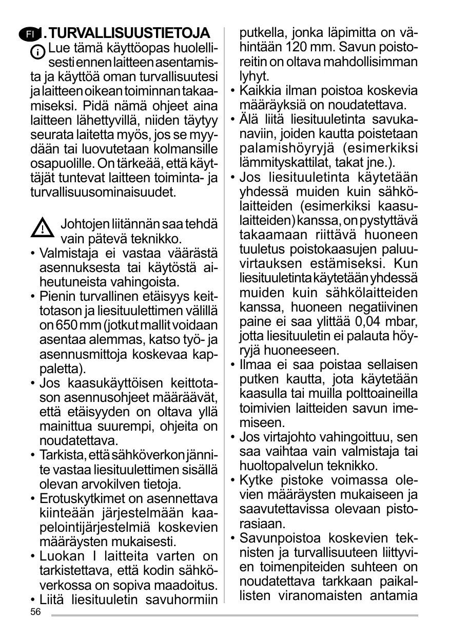 Lesdispositifsdesectionnement doivent être montés dans l’installation fixe conformément aux normes sur les systèmes de câblage. Pour les appareils de Classe I, s’assurer que l’installation électrique de votre intérieur dispose d’une mise à la terre adéquate. Reliez l’aspirateur du conduit de cheminée avec un tube ayant un diamètre minimum de 120 mm. Le parcours des fumées doit être le plus court possible. Respecter toutes les normes concernant l’évacuation de l’air. Ne reliez pas la hotte aspirante aux conduits de cheminée qui acheminent les fumées de combustion (par ex. de chaudières, de cheminées, etc.). Si vous utilisez l’aspirateur en même temps que des appareils non électriques (par ex. fonctionnant au gaz), veillez à ce que la pièce soit adéquatement ventilée, afin d’empêcher le retour du flux des gaz d’évacuation. Si vous utilisez la hotte de cuisine en même temps que des appareils non alimentés à l’électricité, la pression négative dans la pièce ne doit pas dépasser 0,04 mbar, 15