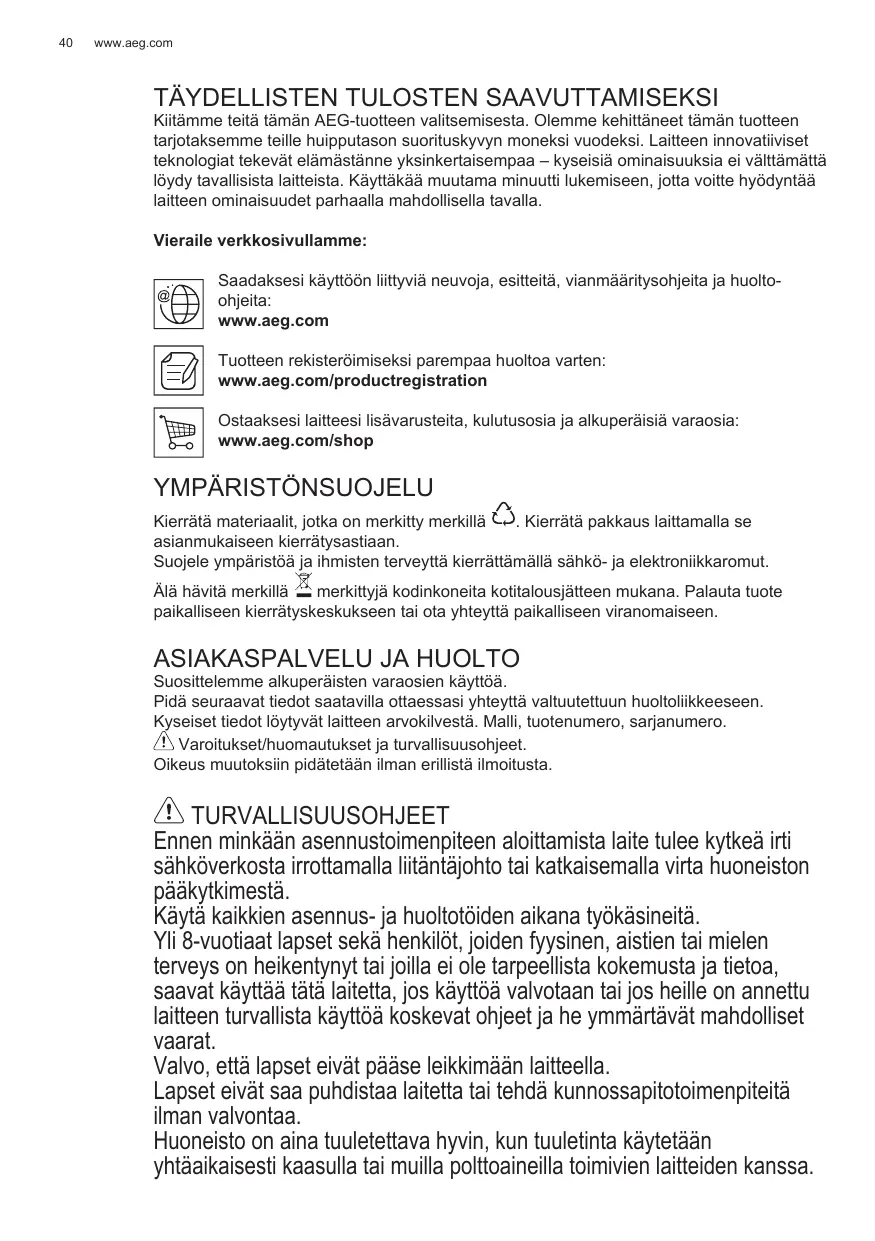 Kiitämme teita tämän AEG-tuotteen valitsemisesta. Olemme kehittäeneet tämän tuotteen tarjotaksemme teille huipputason suorituskyvyn moneksi vuodeksi. Laitteen innovatiiviseteknologiat tekevat elamastanne yksinkertaisempaa - kyseisia ominaisuksia e välttamattä lódy ravallisia laitteista. Käytäkää muutama minuuttlu klemiseen, jotta voitte hyödyntäa laitteen ominausuudet parhaalla mahdolisella ravalla.