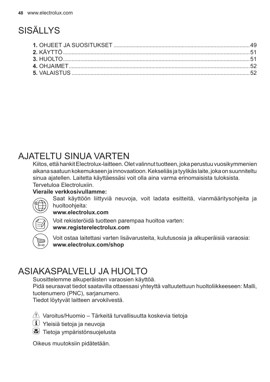 AJATELTU SINUA VARTEN Kiitos, että hankit Electrolux-laitteen. Olet valinnut tuotteen, joka perustuu vuosikymmenien aikana saatuun kokemukseen ja innovaatioon. Kekseliäs ja tyylikäs laite, joka on suunniteltu sinua ajatellen. Laitetta käyttäessäsi voit olla aina varma erinomaisista tuloksista. Tervetuloa Electroluxiin. Vieraile verkkosivullamme: Saat käyttöön liittyviä neuvoja, voit ladata esitteitä, vianmääritysohjeita ja huoltoohjeita: www.electrolux.com Voit rekisteröidä tuotteen parempaa huoltoa varten: www.registerelectrolux.com Voit ostaa laitettasi varten lisävarusteita, kulutusosia ja alkuperäisiä varaosia: www.electrolux.com/shop