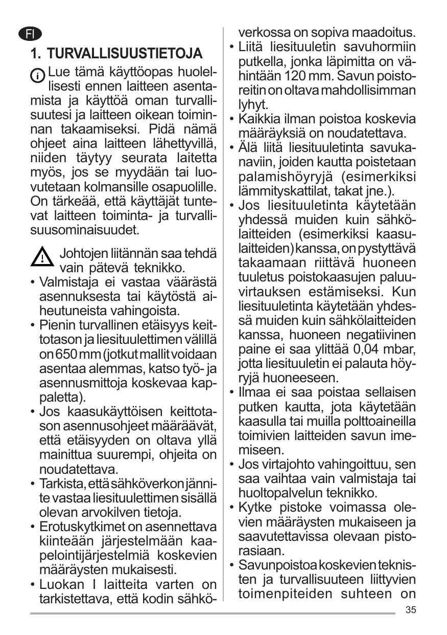 Les dispositifs de sectionnement doivent être montés dans l’installation fixe conformément aux normes sur les systèmes de câblage. Pour les appareils de Classe I, s’assurer que l’installation électrique de votre intérieur dispose d’une mise à la terre adéquate. Reliez l’aspirateur du conduit de cheminée avec un tube ayant un diamètre minimum de 120 mm. Le parcours des fumées doit être le plus court possible. Respecter toutes les normes concernant l’évacuation de l’air. Ne reliez pas la hotte aspirante aux conduits de cheminée qui acheminent les fumées de combustion (par ex. de chaudières, de cheminées, etc.). Si vous utilisez l’aspirateur en même temps que des appareils non électriques (par ex. fonctionnant au gaz), veillez à ce que la pièce soit adéquatement ventilée, afin d’empêcher le retour du flux des gaz d’évacuation. Si vous utilisez la hotte de cuisine en même temps que des appareils non alimentés à l’électricité, la pression négative dans la pièce ne doit pas dépasser 0,04 mbar, afin d’éviter que les fumées soient réaspirées dans la pièce où se trouve la hotte.
