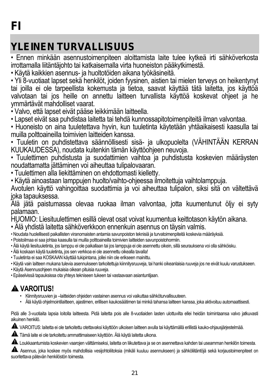 • Les enfants ne doivent pas jouer avec l’appareil. • Le nettoyage et l’entretien par l’usager ne doivent pas être effectués par des enfants sans surveillance. • La pièce doit avoir une aération suffisante lorsque la hotte est utilisée conjointement avec d'autres appareils fonctionnant au gaz ou autres combustibles. • La hotte doit être régulièrement nettoyée à la fois à l'intérieur et à l'extérieur (AU MOINS UNE FOIS PAR MOIS); cela devrait se faire en conformité avec les instructions d'entretien. Le non respect des instructions expressément fournies concernant le nettoyage de la hotte et des filtres peut provoquer des risques d'incendie. • Ne pas flamber d’aliments sous la hotte. • Pour le remplacement de la lampe, utilisez uniquement le type de lampe spécifié dans la section remplacement/maintenance lampe dans ce manuel. L'utilisation d'une flamme nue est dommageable pour les filtres et peut causer un incendie, par conséquent, il est déconseillé de l'utiliser. La friture doit être faite avec soin afin de s’assurer que l’huile surchauffée ne prenne pas feu. AVERTISSEMENT: Lorsque la table de cuisson est en fonctionnement, les parties accessibles de la hotte peuvent devenir très chaudes. • Ne pas brancher l'appareil au réseau électrique avant que l'installation ne soit complètement terminée.