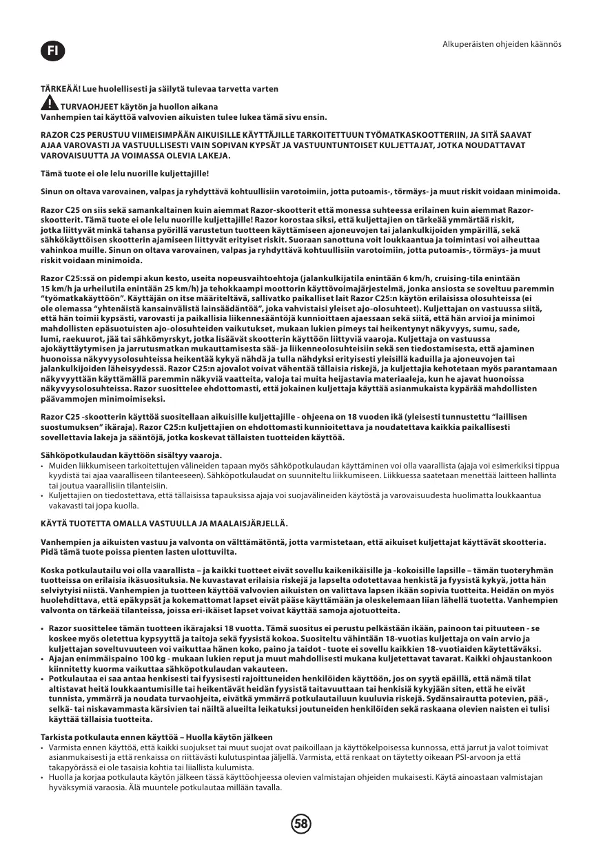 Ce produit n’est pas un jouet pour jeunes utilisateurs ! Vous devez être prudent, attentif et prendre des précautions raisonnables pour réduire au minimum les risques de chute, d’accident ou autres problèmes. Le Razor C25 est donc nécessairement à la fois comparable, mais par beaucoup d’aspects, différent des précédents scooters Razor. Ce produit n’est pas un jouet pour jeunes utilisateurs ! Razor souligne donc l’importance pour les utilisateurs de bien comprendre les risques associés à l’utilisation de quasiment tout produit à roues près de la circulation des véhicules ou des piétons ainsi que les risques spécifiques à conduire un scooter électrique. Pour le dire brutalement, vous pourriez être blessé et vos actions pourraient causer des blessures à d’autres. Vous devez être prudent, attentif et prendre des précautions raisonnables pour réduire au minimum les risques de chute, d’accident ou autres problèmes. Pour l’essentiel, le Razor C25 a une autonomie sur batterie supérieure, plusieurs options de vitesse (Mode piéton jusqu’à 6 km/h, Mode croisière jusqu’à 15 km/h (9,3 mph) et Mode sport jusqu’à 25 km/h (15,5 mph)), et un système de propulsion à moteur dans le moyeu plus efficace qui le destine plus aux usages de « trajet domicile-travail ». L’utilisateur doit être et est de toute façon responsable de la vérification de la possibilité d’utiliser le Razor C25 dans diverses circonstances d’après les lois locales (il n’y a pas de « loi internationale uniforme » actuellement pour définir des conditions d’utilisation universelles). Le conducteur doit être et est de toute façon responsable d’agir de façon raisonnée, prudente et dans le respect des règles du code de la route local pendant la conduite, et ce conducteur doit être et est de toute façon responsable de l’évaluation et de la prise en compte des conditions de conduite potentiellement néfastes, notamment conditions d’éclairage ou de visibilité insuffisantes, brouillard, pluie, neige, grêle, verglas ou orages à éclairs, qui augmentent les dangers inhérents à l’utilisation de tout scooter. Le conducteur doit être et est de toute façon responsable de l’ajustement de son comportement de conduite et de sa distance de freinage en fonction des conditions météorologiques et de circulation, ainsi que de prendre en compte la diminution des possibilités de voir et être vu par faible visibilité, en particulier sur route publique et près de véhicules ou de piétons. Les feux avant et arrière du Razor C25 peuvent réduire ces risques, et les utilisateurs sont aussi encouragés à améliorer leur visibilité ou leur signalisation par des vêtements à haute visibilité, des feux ou autres éléments réfléchissants pour conduire par visibilité réduite. Razor recommande aussi absolument à tout utilisateur de porter un casque approprié pour limiter les blessures potentielles à la tête. L’utilisation du scooter Razor C25 est recommandée aux conducteurs adultes -- avec un âge conseillé de plus de 18 ans (généralement considéré comme un âge de « consentement juridique »). Les utilisateurs du Razor C25 doivent assurément respecter et adopter toutes les lois et règles applicables localement à l’utilisation de ces produits. L’utilisation d’une trottinette électrique présente des risques potentiels. • Comme tout autre produit mobile, une trottinette électrique peut être dangereuse (par exemple, on peut tomber ou être confronté à une situation dangereuse). Il va de soi que les trottinettes électriques sont conçues pour se déplacer; il est donc possible que l’utilisateur perde la maîtrise ou soit confronté à des situations dangereuses. • Les utilisateurs doivent comprendre que si une telle situation se présente, un utilisateur peut subir des blessures graves, voire mortelles, même s’il utilise l’équipement de sécurité et qu’il respecte les autres précautions de sécurité. UTILISER LES TROTTINETTES À VOS PROPRES RISQUES ET FAIRE PREUVE DE BON SENS. La présence d’un parent ou d’un adulte responsable est indispensable pour s’assurer de l’utilisation par des conducteurs novices. Conserver ce produit hors de portée des enfants. Parce que les trottinettes peuvent être dangereuses et que tout produit n’est pas approprié aux enfants de tout âge ou de toute taille, il existe différentes recommandations relatives à l’âge dans cette catégorie de produits, qui ont pour but de refléter la nature des dangers et les capacités physiques ou mentales prévues, ou les deux, qu’un enfant possède pour faire face aux dangers. Les parents et les adultes chargés de surveiller les enfants doivent choisir des produits mobiles adaptés à l’âge de l’enfant qui utilisera la trottinette électrique et prendre les précautions afin d’éviter que les enfants trop immatures ou inexpérimentés pour les caractéristiques d’un produit se mettent en danger. Une supervision par les parents est essentielle quand des enfants d’âge différent peuvent avoir accès à ces produits. • La société Razor recommande que l’usage de ce produit ne soit pas permis aux enfants âgés de moins de 18 ans. Cette recommandation est fondée non, tout simplement, sur l’âge, le poids ou la taille ; mais elle reflète la prise en compte de la maturité attendue ainsi que l’aspect physique. L’âge recommandé de 18 ans ou plus est seulement une estimation, et il peut être affecté par la taille, le poids ou les capacités de l’utilisateur. - ce produit ne sera pas considéré comme convenant, d’emblée, pour chaque enfant âgé de 18 ans. • Poids maximal du conducteur 100 kg – y compris sacs à dos et autres articles pouvant être transportés. Toute charge fixée au guidon dégrade la stabilité du scooter électrique. • Toute personne présentant des problèmes mentaux ou physiques 