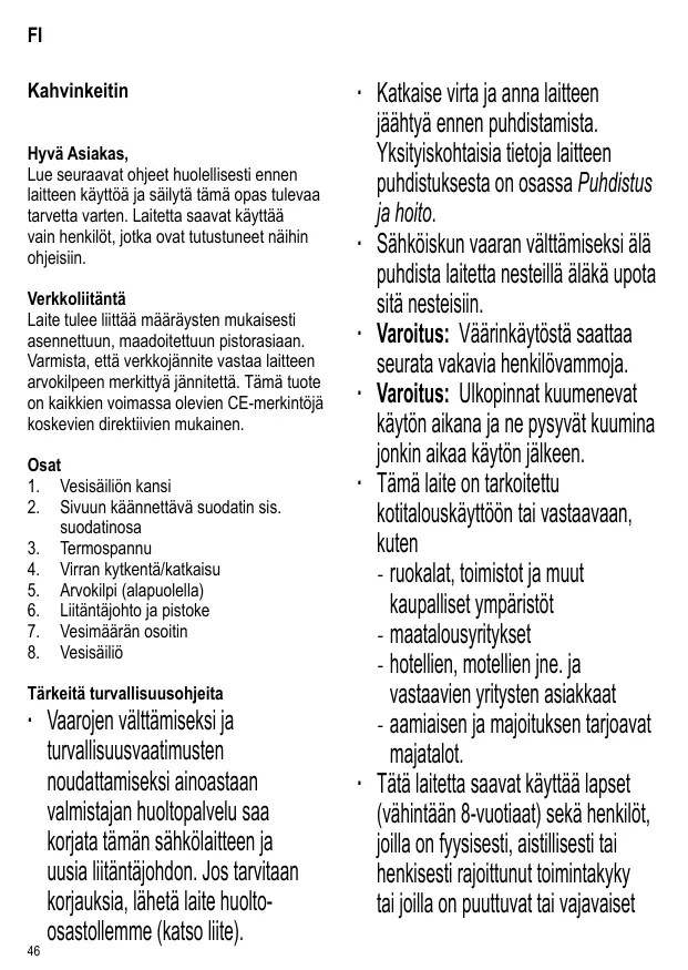 Kahvinkeitin Hyvä Asiakas, Lue seuraavat ohjeet huolellisesti ennen laitteen käyttöä ja säilytä tämä opas tulevaa tarvetta varten. Laitetta saavat käyttää vain henkilöt, jotka ovat tutustuneet näihin ohjeisiin. Verkkoliitäntä Laite tulee liittää määräysten mukaisesti asennettuun, maadoitettuun pistorasiaan. Varmista, että verkkojännite vastaa laitteen arvokilpeen merkittyä jännitettä. Tämä tuote on kaikkien voimassa olevien CE-merkintöjä koskevien direktiivien mukainen. Osat