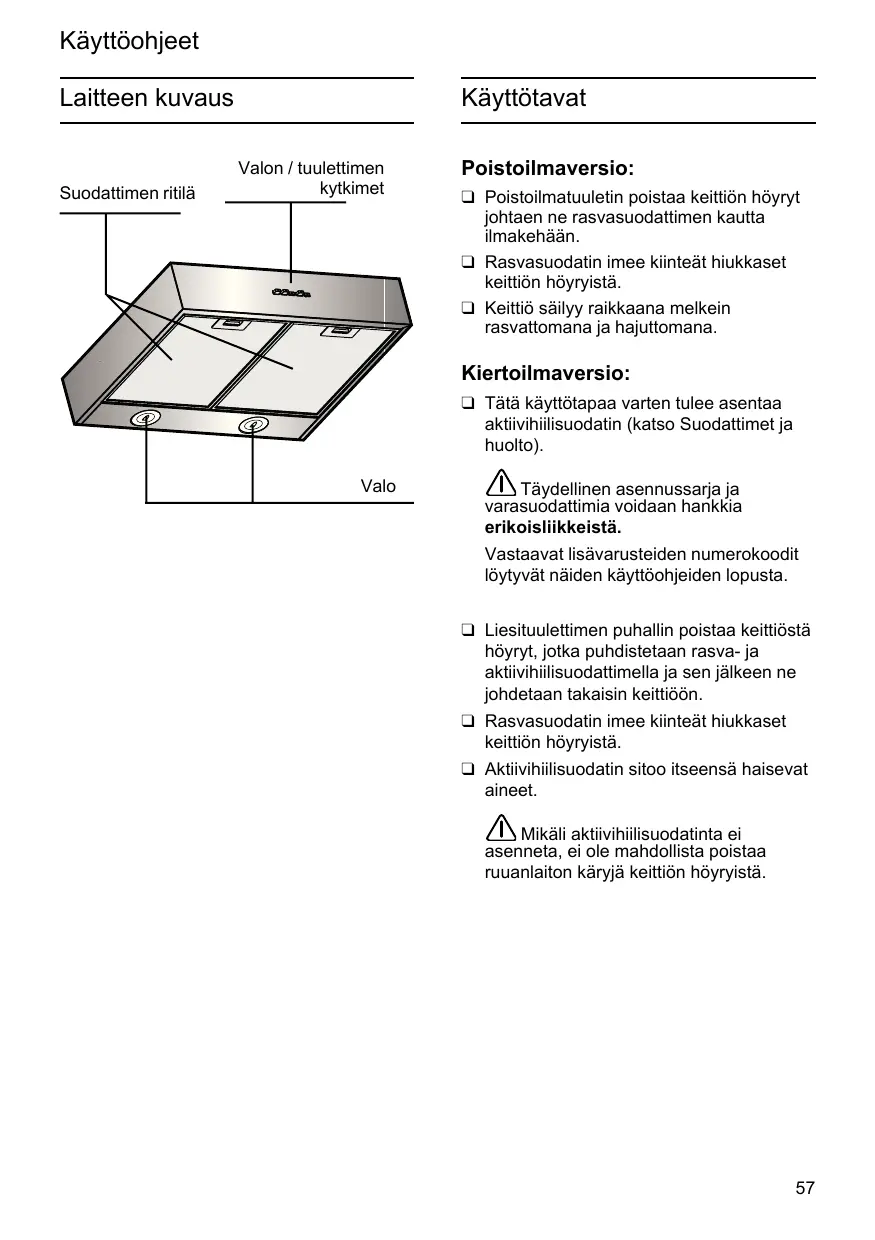 Poistoilmaversio: ❑ Poistoilmatuuletin poistaa keittiön höyryt johtaen ne rasvasuodattimen kautta ilmakehään. ❑ Rasvasuodatin imee kiinteät hiukkaset keittiön höyryistä. ❑ Keittiö säilyy raikkaana melkein rasvattomana ja hajuttomana.