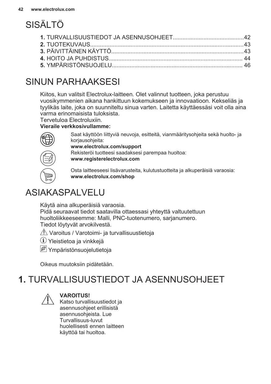 SINUN PARHAAKSESI Kiitos, kun valitsit Electrolux-laitteen. Olet valinnut tuotteen, joka perustuu vuosikymmenien aikana hankittuun kokemukseen ja innovaatioon. Kekseliäs ja tyylikäs laite, joka on suunniteltu sinua varten. Laitetta käyttäessäsi voit olla aina varma erinomaisista tuloksista. Tervetuloa Electroluxiin. Vieraile verkkosivullamme: Saat käyttöön liittyviä neuvoja, esitteitä, vianmääritysohjeita sekä huolto- ja korjausohjeita: www.electrolux.com/support Rekisteröi tuotteesi saadaksesi parempaa huoltoa: www.registerelectrolux.com Osta laitteeseesi lisävarusteita, kulutustuotteita ja alkuperäisiä varaosia: www.electrolux.com/shop ASIAKASPALVELU Käytä aina alkuperäisiä varaosia. Pidä seuraavat tiedot saatavilla ottaessasi yhteyttä valtuutettuun huoltoliikkeeseemme: Malli, PNC-tuotenumero, sarjanumero. Tiedot löytyvät arvokilvestä. Varoitus / Varotoimi- ja turvallisuustietoja Yleistietoa ja vinkkejä Ympäristönsuojelutietoja Oikeus muutoksiin pidätetään.