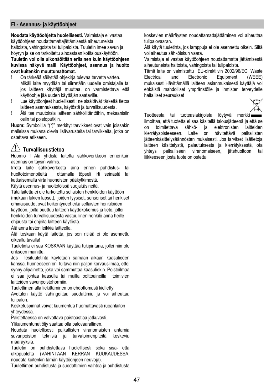 Attention! Ne pas raccorder l’appareil au circuit électrique avant que le montage ne soit complètement terminé. Avant toute opération de nettoyage ou d’entretien, débrancher la hotte du circuit électrique en retirant la prise ou en coupant l’interrupteur général de l’habitation. Munissez-vous de gants de travail avant d’effectuer toute opération d’installation et d’entretien. L’appareil n’est pas destiné à une utilisation par des enfants ou des personnes à capacités physiques, sensorielles ou mentales réduites et sans expérience et connaissance à moins qu’ils ne soient sous la supervision ou formés sur l’utilisation de l’appareil par une personne responsable de leur sécurité. Les enfants doivent être surveillés afin qu’ils ne jouent pas avec l’appareil. Ne jamais utiliser la hotte sans que la grille ne soit montée correctement! La hotte ne doit JAMAIS être utilisée comme plan pour déposer quelque chose sauf si cela est expressément indiqué. Quand la hotte est utilisée en même temps que d’autres appareils à combustion de gaz ou d’autres combustibles, le local doit disposer d’une ventilation suffisante. L’air aspiré ne doit jamais être envoyé dans un conduit utilisé pour l’évacuation des fumées produites par des appareils à combustion de gaz ou d’autres combustibles. Il est formellement interdit de faire flamber les aliments sous la hotte. L’utilisation de flammes libres peut entraîner des dégâts aux filtres et peut donner lieu à des incendies, il faut donc les éviter à tout prix.