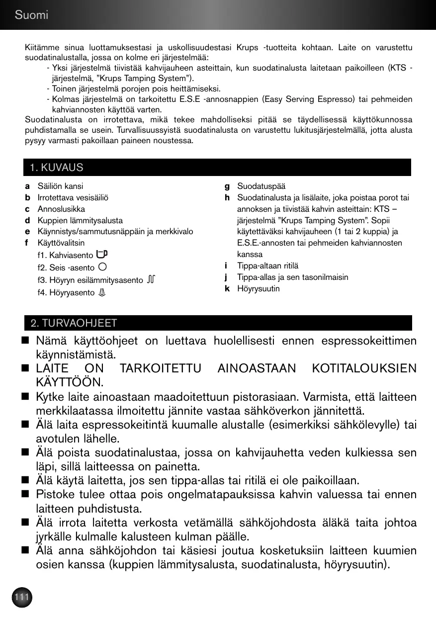 - L’un pour le tassage progressif de la mouture lors du positionnement du porte-filtre (système KTS « Krups Tamping System »). - L’autre pour l’éjection du marc. - Le dernier pour l’utilisation de dosettes E.S.E. (Easy Serving Espresso) ou souples. Il est en outre démontable, ce qui permet de le maintenir, par des nettoyages fréquents, en parfait état de fonctionnement. Par sécurité, votre porte-filtre est équipé d’un système de verrouillage pour qu’il reste en place lors de la montée en pression.