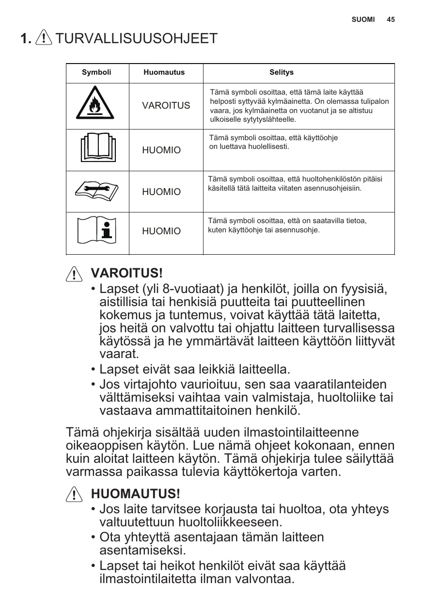 - Lapset eivät saa puhdistaa ja ylläpitää laitetta ilman valvontaa. Huomaa, että kylmäaine ei välttämättä tuoksu.