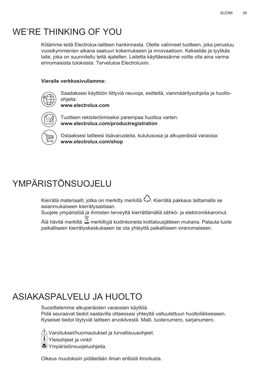 Kiitämme teitä Electrolux-laitteen hankinnasta. Olette valinneet tuotteen, joka perustuu vuosikymmenien aikana saatuun kokemukseen ja innovaatioon. Kekseliäs ja tyylikäs laite, joka on suunniteltu teitä ajatellen. Laitetta käyttäessänne voitte olla aina varma erinomaisista tuloksista. Tervetuloa Electroluxiin. Vieraile verkkosivullamme: Saadaksesi käyttöön liittyviä neuvoja, esitteitä, vianmääritysohjeita ja huoltoohjeita: www.electrolux.com Tuotteen rekisteröimiseksi parempaa huoltoa varten: www.electrolux.com/productregistration Ostaaksesi laitteesi lisävarusteita, kulutusosia ja alkuperäisiä varaosia: www.electrolux.com/shop