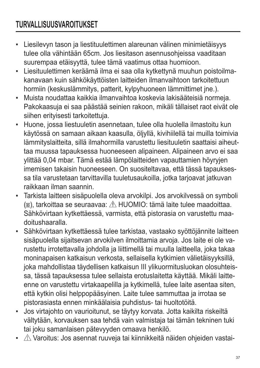 TURVALLISUUSVAROITUKSET ▪ Liesilevyn tason ja liestituulettimen alareunan välinen minimietäisyys tulee olla vähintään 65cm. Jos liesitason asennusohjeissa vaaditaan suurempaa etäisyyttä, tulee tämä vaatimus ottaa huomioon. ▪ Liesituulettimen keräämä ilma ei saa olla kytkettynä muuhun poistoilmakanavaan kuin sähkökäyttöisten laitteiden ilmanvaihtoon tarkoitettuun hormiin (keskuslämmitys, patterit, kylpyhuoneen lämmittimet jne.). ▪ Muista noudattaa kaikkia ilmanvaihtoa koskevia lakisääteisiä normeja. Pakokaasuja ei saa päästää seinien rakoon, mikäli tällaiset raot eivät ole siihen erityisesti tarkoitettuja. ▪ Huone, jossa liestuuletin asennetaan, tulee olla huolella ilmastoitu kun käytössä on samaan aikaan kaasulla, öljyllä, kivihiilellä tai muilla toimivia lämmityslaitteita, sillä ilmahormilla varustettu liesituuletin saattaisi aiheuttaa muussa tapauksessa huoneeseen alipaineen. Alipaineen arvo ei saa ylittää 0,04 mbar. Tämä estää lämpölaitteiden vapauttamien höyryjen imemisen takaisin huoneeseen. On suositeltavaa, että tässä tapauksessa tila varustetaan tarvittavilla tuuletusaukoilla, jotka tarjoavat jatkuvan raikkaan ilman saannin. ▪ Tarkista laitteen sisäpuolella oleva arvokilpi. Jos arvokilvessä on symboli ( ), tarkoittaa se seuraavaa: HUOMIO: tämä laite tulee maadoittaa. Sähkövirtaan kytkettäessä, varmista, että pistorasia on varustettu maadoitushaaralla. ▪ Sähkövirtaan kytkettäessä tulee tarkistaa, vastaako syöttöjännite laitteen sisäpuolella sijaitsevan arvokilven ilmoittamia arvoja. Jos laite ei ole varustettu irrotettavalla johdolla ja liittimellä tai muulla laitteella, joka takaa moninapaisen katkaisun verkosta, sellaisella kytkimien välietäisyyksillä, joka mahdollistaa täydellisen katkaisun III ylikuormitusluokan olosuhteissa, tässä tapauksessa tulee sellaista erotuslaitetta käyttää. Mikäli laitteenne on varustettu virtakaapelilla ja kytkimellä, tulee laite asentaa siten, että kytkin olisi helppopääsyinen. Laite tulee sammuttaa ja irrotaa se pistorasiasta ennen minkäälaisia puhdistus- tai huoltotöitä. ▪ Jos virtajohto on vaurioitunut, se täytyy korvata. Jotta kaikilta riskeiltä vältytään, korvauksen saa tehdä vain valmistaja tai tämän tekninen tuki tai joku samanlaisen pätevyyden omaava henkilö. ▪ Varoitus: Jos asennat ruuveja tai kiinnikkeitä näiden ohjeiden vastai37