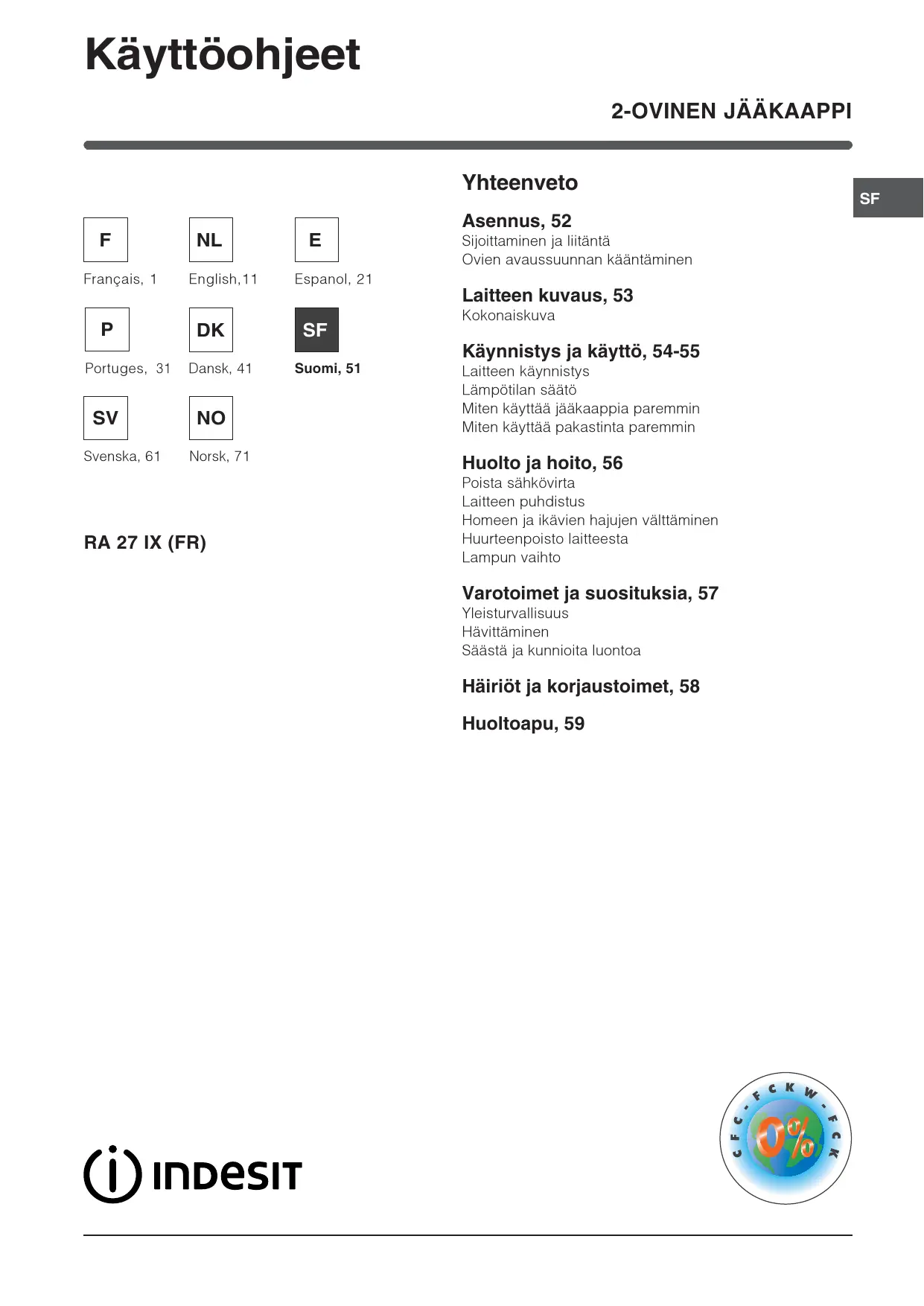 RA27 - Jääkaappi INDESIT - Notice d'utilisation et mode d'emploi gratuit