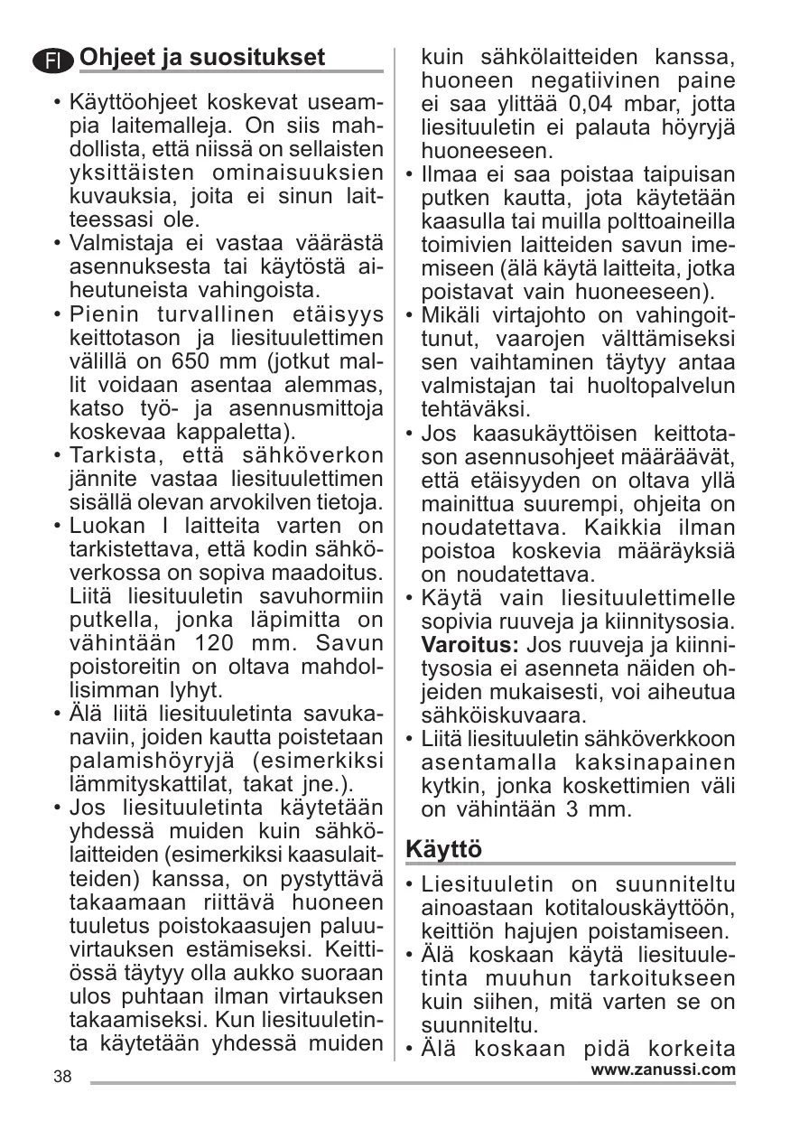 FI Ohjeet ja suositukset • Käyttöohjeet koskevat useampia laitemalleja. On siis mahdollista, että niissä on sellaisten yksittäisten ominaisuuksien kuvauksia, joita ei sinun laitteessasi ole. • Valmistaja ei vastaa väärästä asennuksesta tai käytöstä aiheutuneista vahingoista. • Pienin turvallinen etäisyys keittotason ja liesituulettimen välillä on 650 mm (jotkut mallit voidaan asentaa alemmas, katso työ- ja asennusmittoja koskevaa kappaletta). • Tarkista, että sähköverkon jännite vastaa liesituulettimen sisällä olevan arvokilven tietoja. • Luokan I laitteita varten on tarkistettava, että kodin sähköverkossa on sopiva maadoitus. Liitä liesituuletin savuhormiin putkella, jonka läpimitta on vähintään 120 mm. Savun poistoreitin on oltava mahdollisimman lyhyt. • Älä liitä liesituuletinta savukanaviin, joiden kautta poistetaan palamishöyryjä (esimerkiksi lämmityskattilat, takat jne.). • Jos liesituuletinta käytetään yhdessä muiden kuin sähkölaitteiden (esimerkiksi kaasulaitteiden) kanssa, on pystyttävä takaamaan riittävä huoneen tuuletus poistokaasujen paluuvirtauksen estämiseksi. Keittiössä täytyy olla aukko suoraan ulos puhtaan ilman virtauksen takaamiseksi. Kun liesituuletinta käytetään yhdessä muiden 38