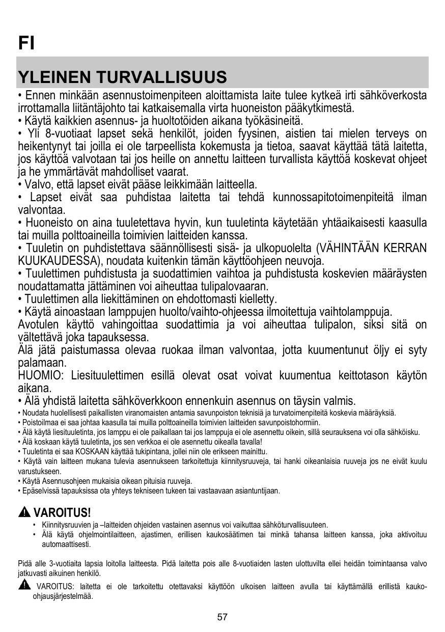 • Les enfants ne doivent pas jouer avec l’appareil. • Le nettoyage et l’entretien par l’usager ne doivent pas être effectués par des enfants sans surveillance. • La pièce doit avoir une aération suffisante lorsque la hotte est utilisée conjointement avec d'autres appareils fonctionnant au gaz ou autres combustibles. • La hotte doit être régulièrement nettoyée à la fois à l'intérieur et à l'extérieur (AU MOINS UNE FOIS PAR MOIS); cela devrait se faire en conformité avec les instructions d'entretien. Le non respect des instructions expressément fournies concernant le nettoyage de la hotte et des filtres peut provoquer des risques d'incendie. • Ne pas flamber d’aliments sous la hotte. • Pour le remplacement de la lampe, utilisez uniquement le type de lampe spécifié dans la section remplacement/maintenance lampe dans ce manuel. L'utilisation d'une flamme nue est dommageable pour les filtres et peut causer un incendie, par conséquent, il est déconseillé de l'utiliser. La friture doit être faite avec soin afin de s’assurer que l’huile surchauffée ne prenne pas feu. AVERTISSEMENT: Lorsque la table de cuisson est en fonctionnement, les parties accessibles de la hotte peuvent devenir très chaudes. • Ne pas brancher l'appareil au réseau électrique avant que l'installation ne soit complètement terminée. • En ce qui concerne les mesures techniques et de sécurité à prendre pour l'évacuation des fumées, respectez strictement les dispositions des règlements locales. • L’air ne doit pas être envoyé dans un conduit utilisé pour évacuer les fumées d’appareils utilisant du gaz ou un autre combustible. • Ne pas utiliser ou laisser la hotte sans les lampes correctement montées, car un éventuel risque de choc électrique est possible. • N’utilisez jamais la hotte sans la grille montée correctement! • La hotte ne doit JAMAIS être utilisée comme une surface d'appui, sauf indication expresse. • Utilisez uniquement les vis de fixation fournies avec le produit pour l'installation, ou, si non fournies, acheter le type correct de vis. • Utilisez la longueur correcte pour les vis qui sont identifiées dans le Guide d'installation. • En cas de doute, consultez votre centre de service agréé ou du personnel qualifié.