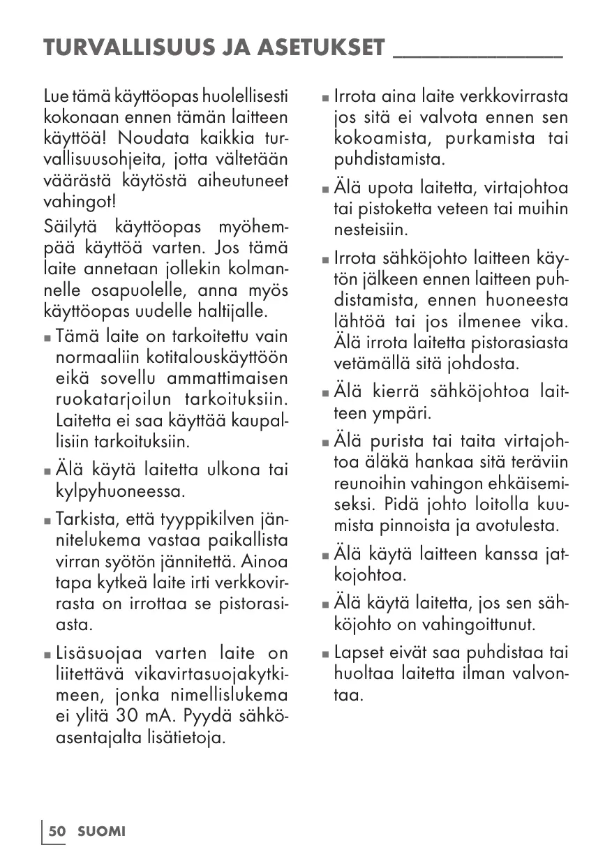Conservez le manuel d'utilisation car vous pourriez en avoir besoin ultérieurement. Dans le cas où cet appareil change de propriétaire, remettez également le manuel d'utilisation au nouveau bénéficiaire. Le présent appareil est destiné à un usage domestique privé uniquement et ne saurait convenir à une utilisation professionnelle en restauration. Il ne doit pas être utilisé à des fins commerciales. Évitez d'utiliser l'appareil à l'extérieur ou dans la salle de bain. Assurez-vous que la tension de secteur figurant sur la plaque signalétique correspond à votre alimentation secteur locale. Le seul moyen de déconnecter l'appareil du secteur consiste à débrancher la prise.