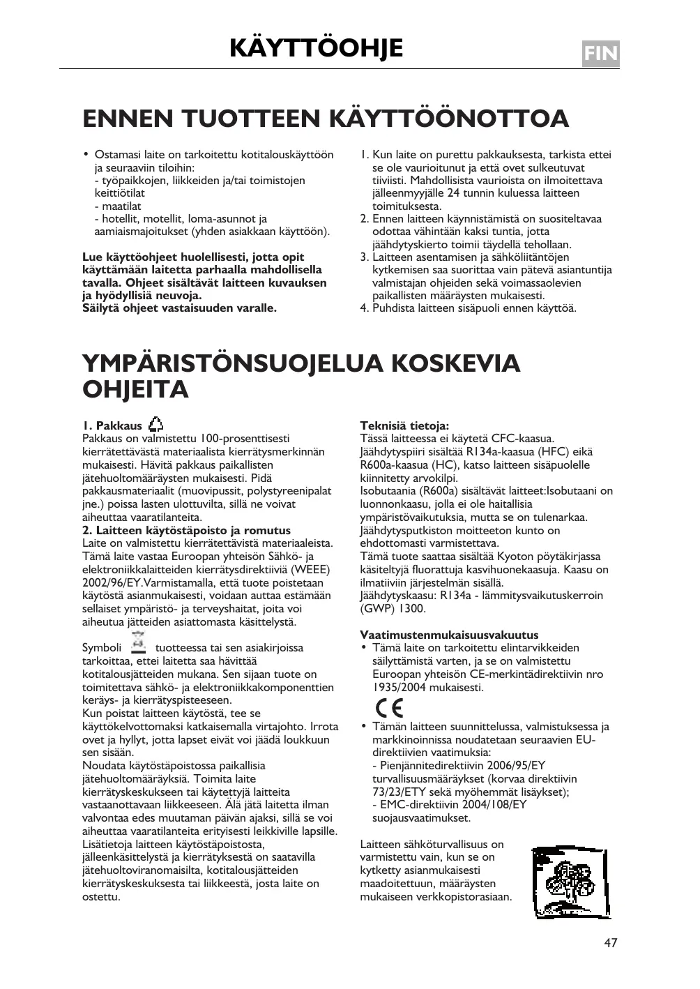 à lire attentivement les instructions être utilisé dans un environnement domestique, relatives son utilisation ; vous y trouverez la maisà aussi : description appareil et des - dans de les votre zones de cuisine des lieuxconseils de travail, utiles pour la conservation magasins et/ou bureaux des aliments. - danscette les fermes Conservez notice d’emploi pour tot’ute - dans les hôtels, les motels, les résidences, les bed consultation ultérieure. & avoir breakfasts à usage exclusif du client. qu’il n’est 1. Après déballé l’appareil, assurez-vous pas endommagé et que les portes ferment Pour utiliser au dommage mieux votre appareil, parfaitement. Tout éventuel devranous être vous invitons à lire attentivement instructions signalé au revendeur dans un délai les de 24 heures. relatives à son utilisation ; vous trouverez 2. Nous vous conseillons d’attendre auymoins deux la description votrel’appareil appareil en et service des conseils heures avant dedemettre afin que la conservation des aliments. le utiles circuit pour réfrigérant soit pleinement performant. Conservez cette notice d'emploi pour toute 3. Assurez-vous que l’installation et le branchement consultation ultérieure. électrique ont été réalisés par un technicien qualifié, conformément aux instructions du fabricant et aux normes locales en vigueur en matière de sécurité. 4. Nettoyez l’intérieur de l’appareil avant de l’utiliser.